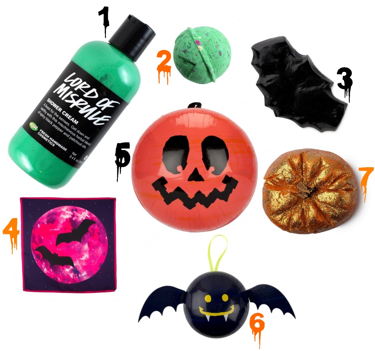 1- Crème de douche Lord of Misrule, 8€50 (les 100gr) / 2- Bombe de bain Lord of Misrule, 5€95 / 3- Gelée de douche Nightwing, 6€95 /4- Tissus Pink Moon Furoshiki, 5€95 / 5- Coffret Pumkin Heebie Jeebie, 17€45 / 6- Coffret Bat Heebie Jeebie, 19€95 / 7-Pain moussant Sparkly Pumpkin, 5€75