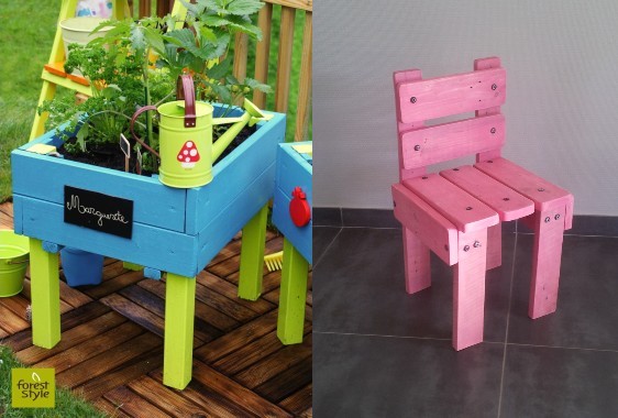 Issu de Pinterest (encore), j’ai pris 2 idées assez facile à réaliser. Je n’ai pas trouvé par contre de site expliquant la marche à suivre mais avec quelques bricoles et un peu de patience, vous transformez ainsi des palettes brutes en véritables chaises et carré potager. Une très bonne idée à faire seul ou avec ses enfants. Et puis c’est trop mignon!