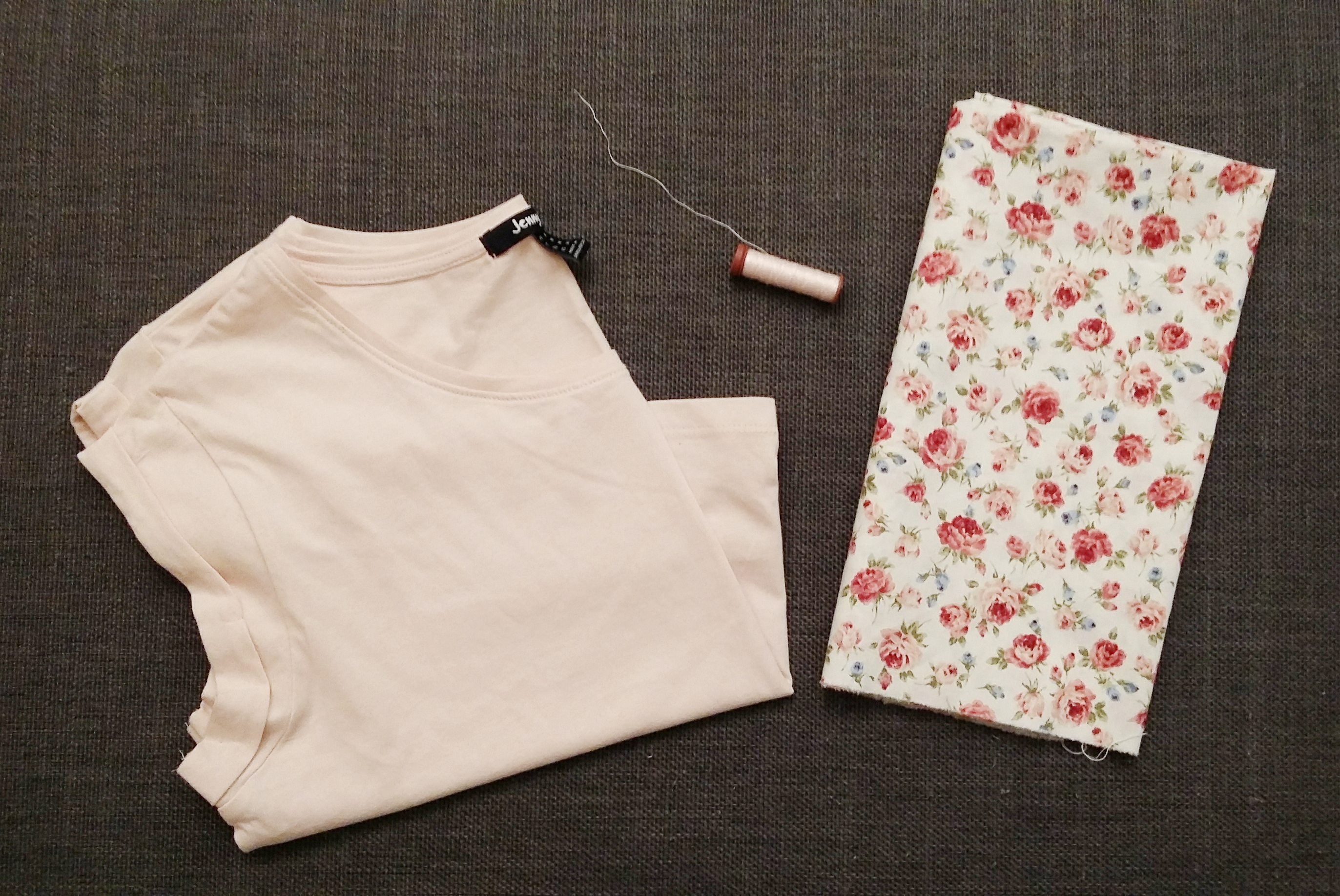 Budget : Tissu fleuri 5,60€ + T-shirt 3€ + Fil rose pale 3,40€ + Fil à bâtir 1,94€ = 13,94€