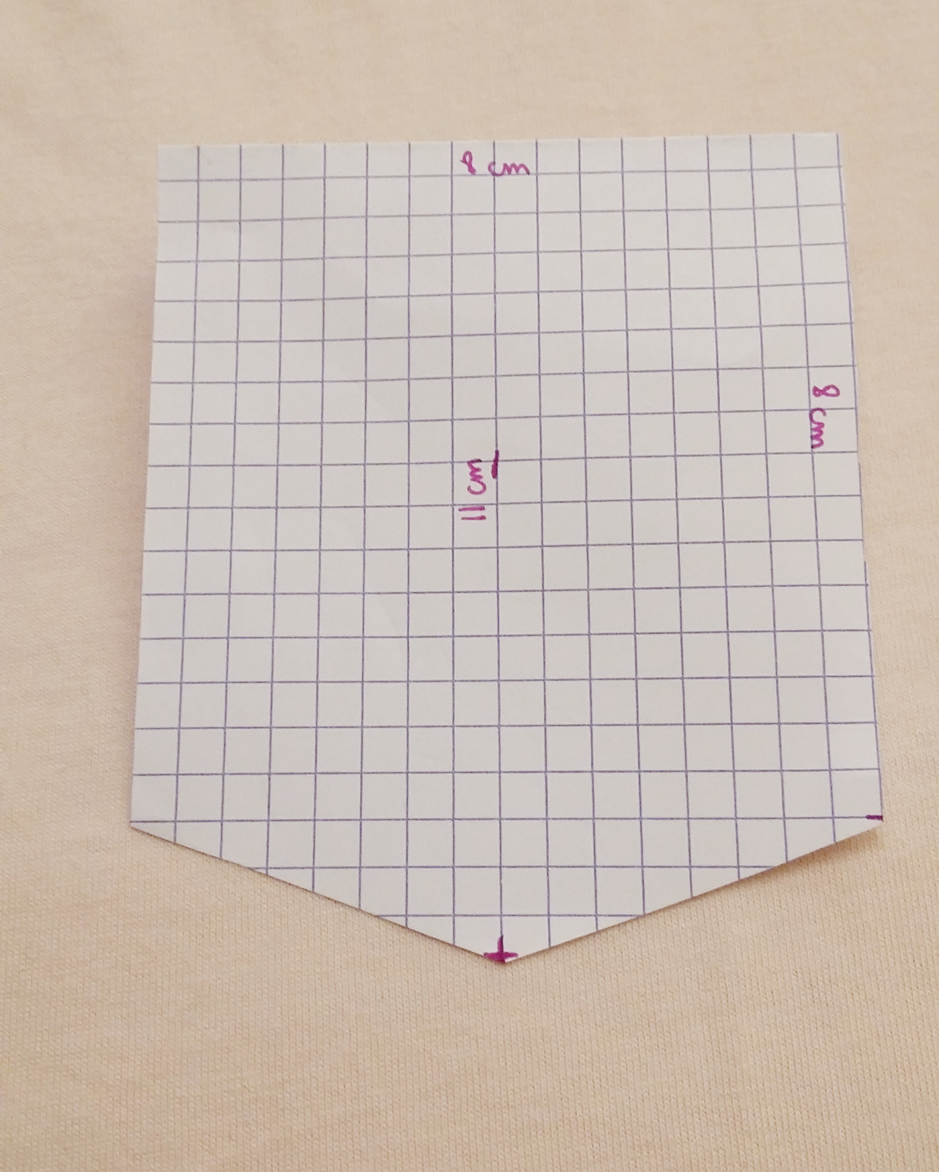 Étape 1 : Faites un patron de la poche que vous souhaitez. J’ai fait une poche simple en style « plaquée » avec une pointe. Découpez-le avec vos ciseaux.