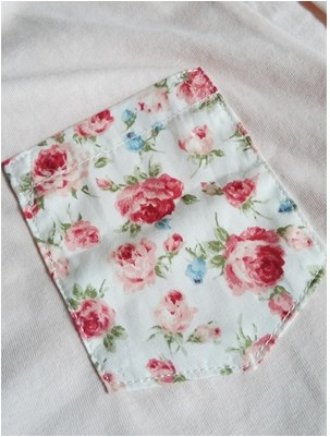 Étape 7 : Bâtissez votre poche avec du fil de bâti pour bien tenir le « rentré ». Le fil à bâtir est très souple et permet de coudre temporairement sur les vêtements avant la couture définitive. On coud grossièrement juste pour tenir le tissu fleuri. Vous pouvez tout aussi bien mettre votre tissu sur le t-shirt avec des épingles et le coudre comme ça mais pour commencez j’ai préféré faire avec cette méthode.