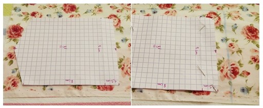 Étape 3 : Laissez 1 cm de chaque côté de votre patron pour la couture. Et fixez votre patron à votre tissu à l’aide d’épingles.