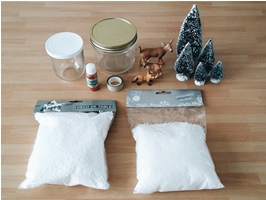 Budget : Bocaux (un pot de Nutella et un chez Noz 1,99€) + Billes de polystyrène 1,49€ + Neige Artificielle 2,19€ + Masking tape (Noz) 0,30€ + Sapin artificiels (La Foir’Fouille) 2,50€ + Animaux (Picwic) 13,47€ = 21,94€
