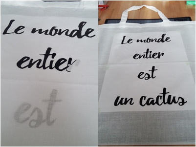 Bonne idée d’utiliser la transparence du sac ! Beaucoup plus facile encore qu’avec du papier transfert! Joli tote bag!