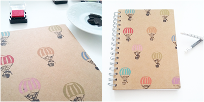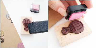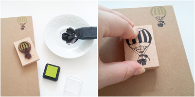 J’ai utilisé un tampon en bois Action avec un motif montgolfière. J’avais aussi pris des encres dans la même enseigne mais la qualité était vraiment pourave, j’ai donc racheté un pack de 10 pigments de la marque IZINK et un tube de peinture acrylique noir Pébéo.