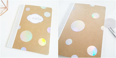 Étape 1 : Prenez votre carnet et vos stickers. Appliquez-les sur la première et la quatrième de couverture. Laissez un espace pour y coller une étiquette ou inscrire votre nom.