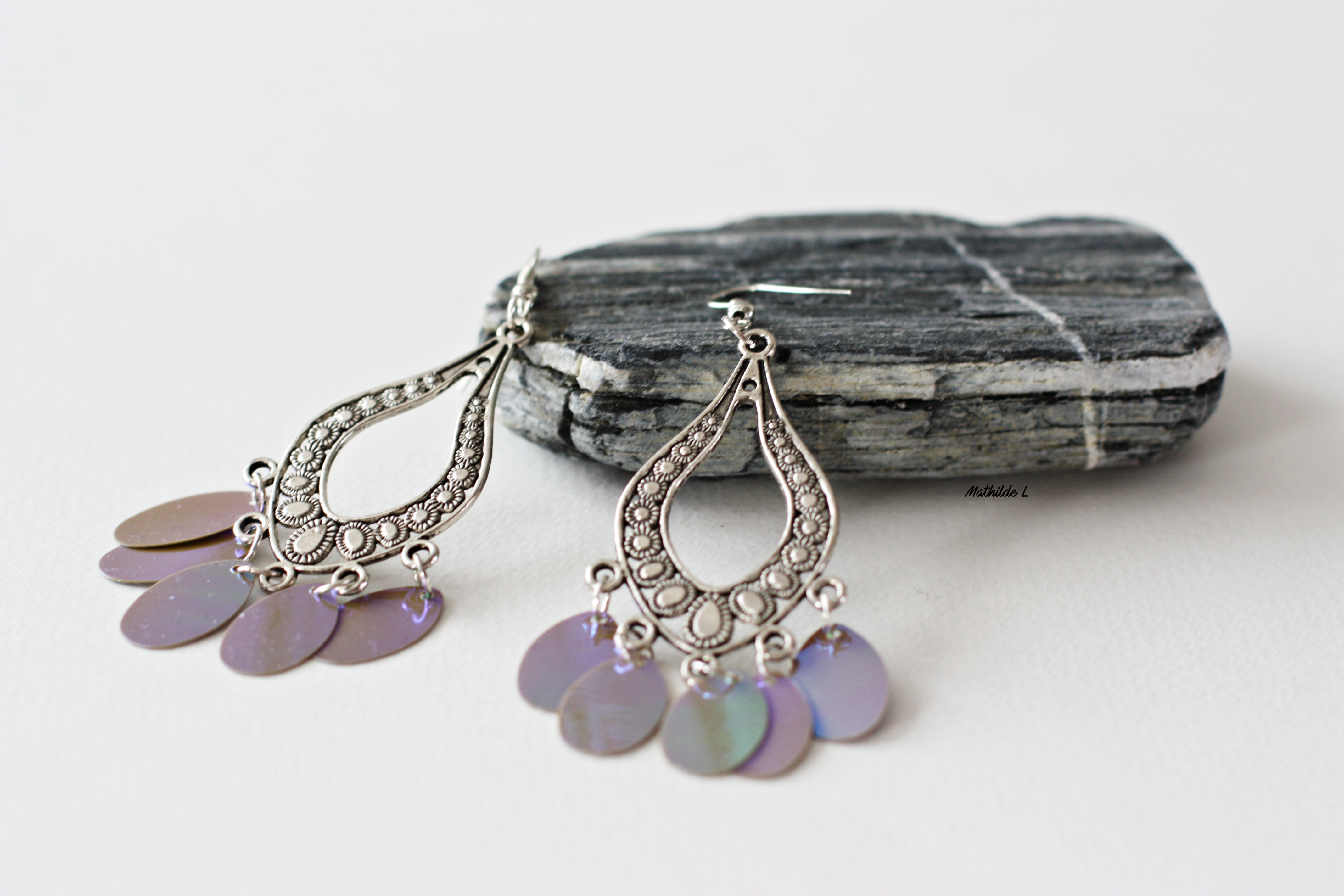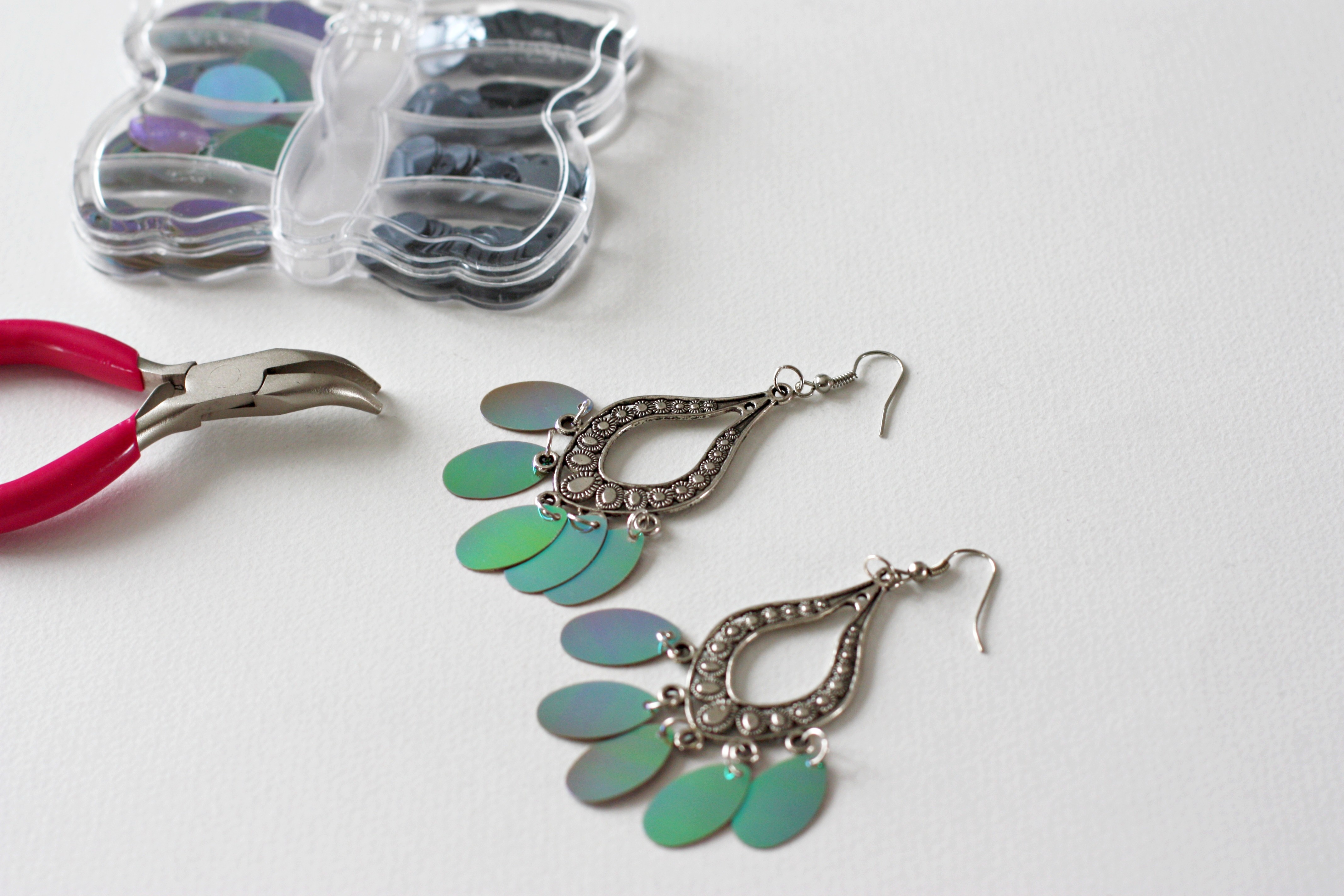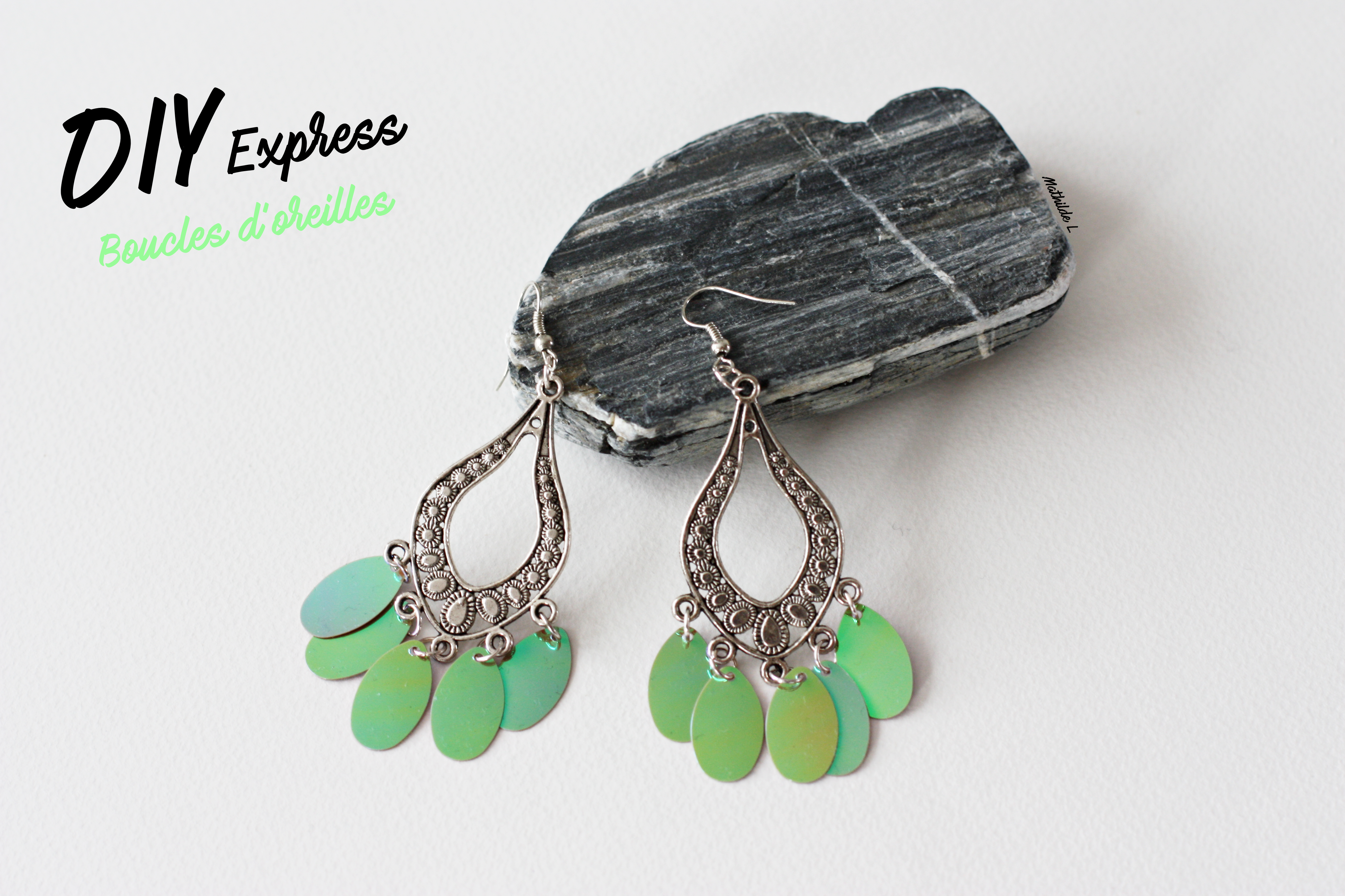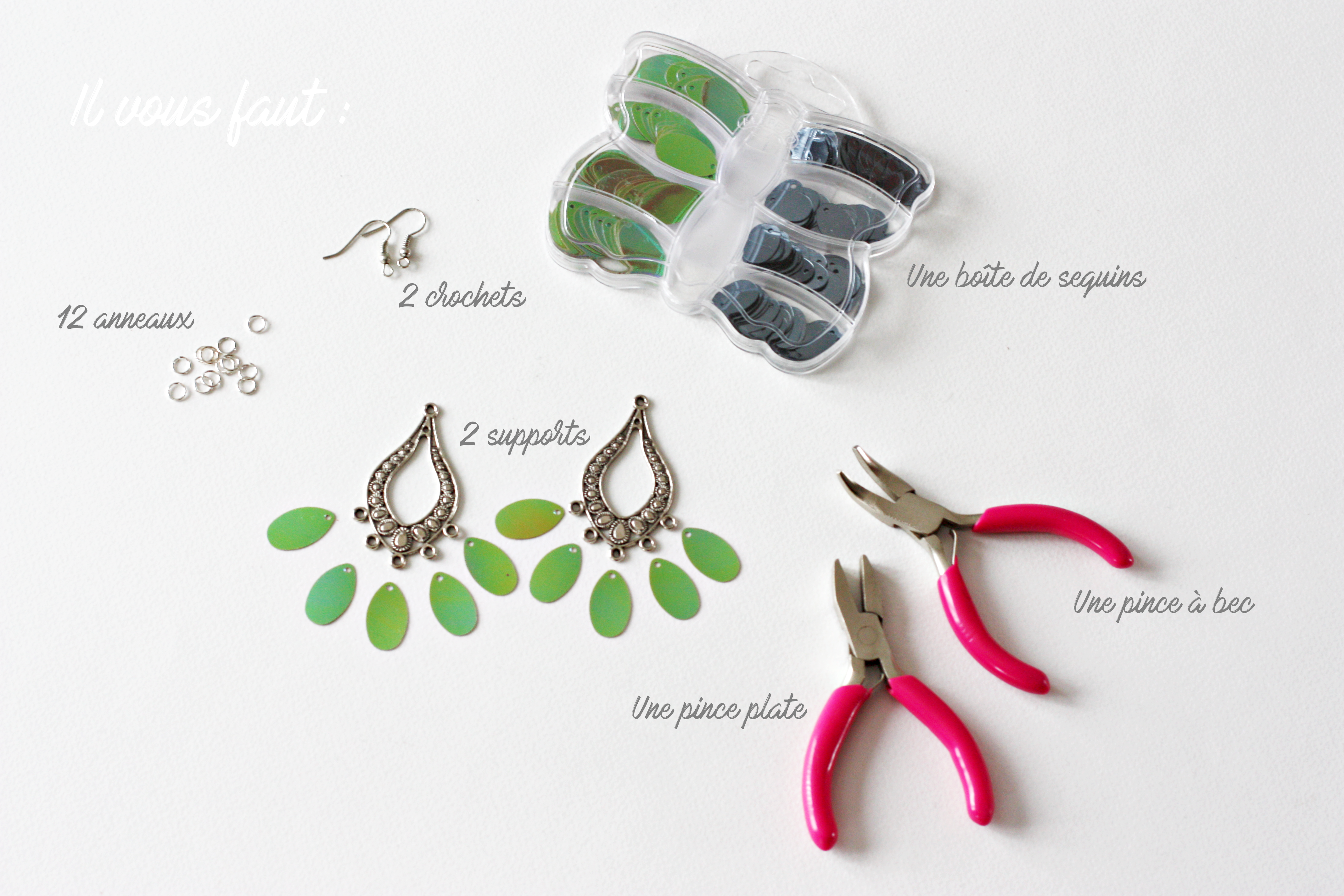 Il y a quelques temps, j’ai acheté chez Noz une boîte de sequins en forme de gouttes sans vraiment savoir ce que j’allais en faire. Les couleurs (irisées vertes et grises) me plaisaient tellement que je ne pouvais pas passer à côté et vu le prix dérisoire, j’ai craqué. Au travail, j’ai repéré un support de boucles d’oreilles en rhodium au mois d’août. Autant vous dire que j’ai flashé dessus, je l’ai même utilisé pour en faire une paire avec des pompons que vous pouvez retrouver ici. J’ai décidé de racheter la même ce mois-ci avant qu’elle ne soit sold out.