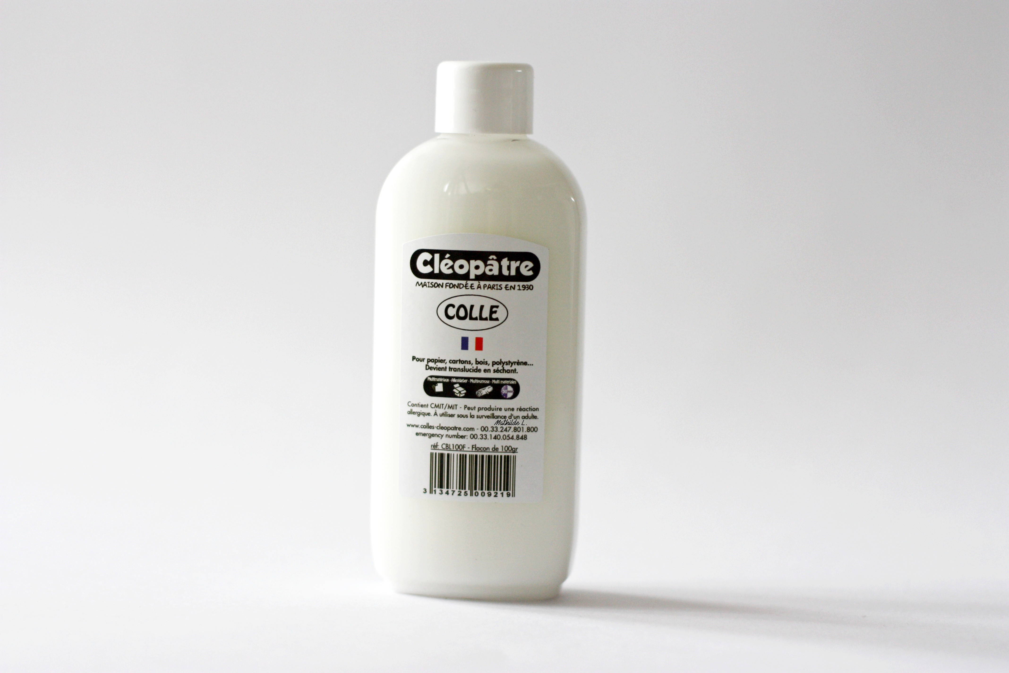 Une autre de mes trouvailles c’est un flacon de colle blanche Cléopâtre à seulement 1,29€ (la bonne affaire) ! Cette colle sert pour tous les supports : papier, cartons, bois, polystyrène… le petit plus c’est qu’elle devient transparente en séchant.