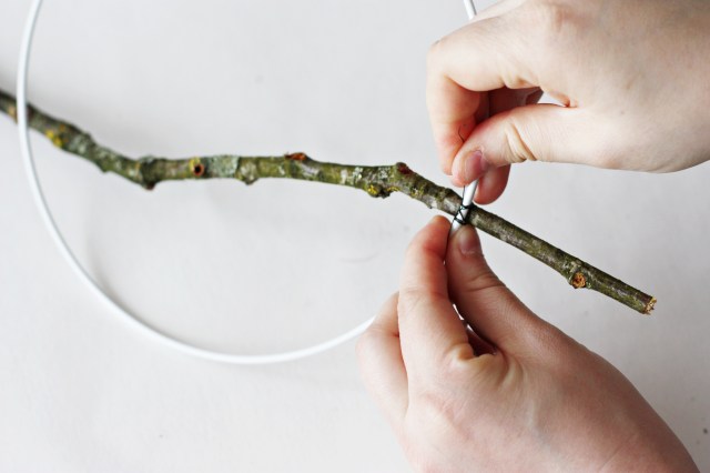 Étape 2 : À l’aide de votre fil de fer, fixez votre branche sur le cercle. Veillez à bien serrer et coupez le surplus avec votre pince.