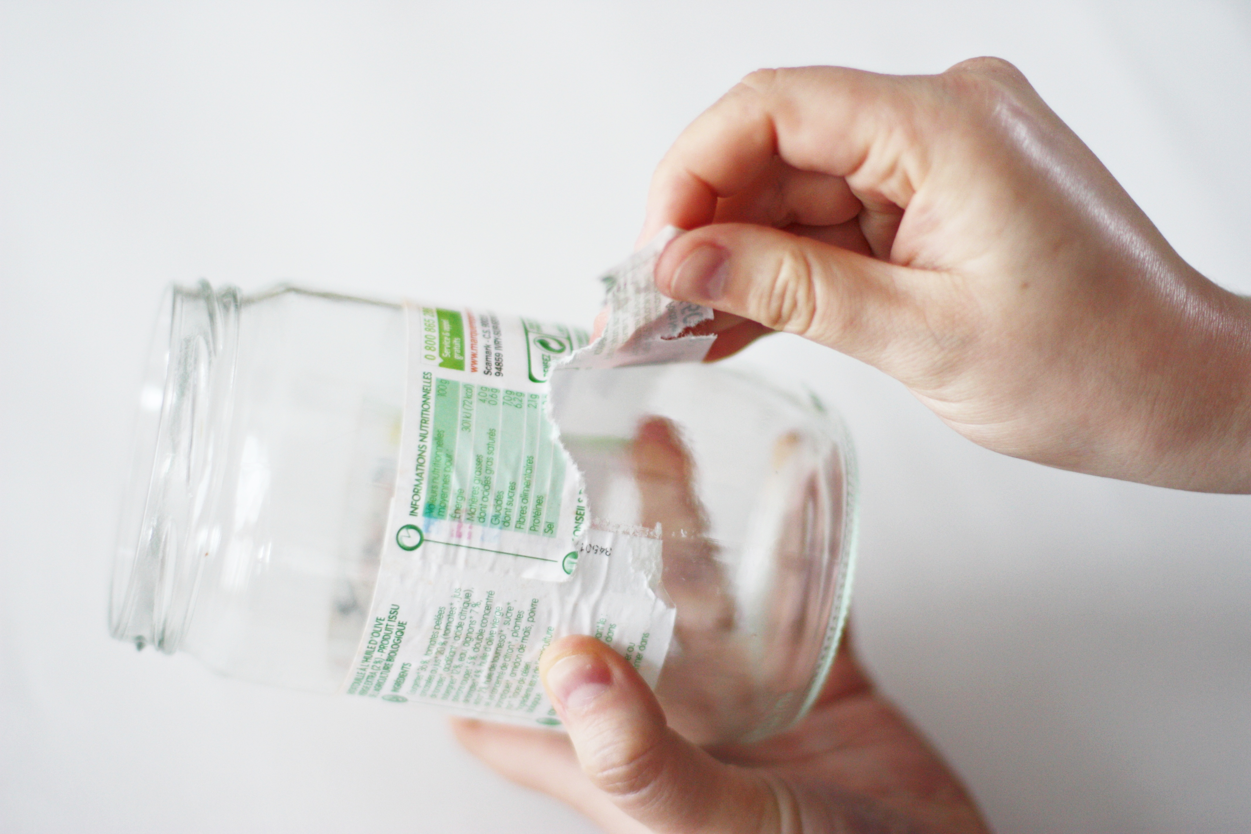 Étape 1 : Tout d’abord, lavez votre bocal et enlevez les étiquettes si il y en a. Enlevez la colle avec un peu d’eau chaude. Laissez sécher et essuyez pour éviter toutes poussières.