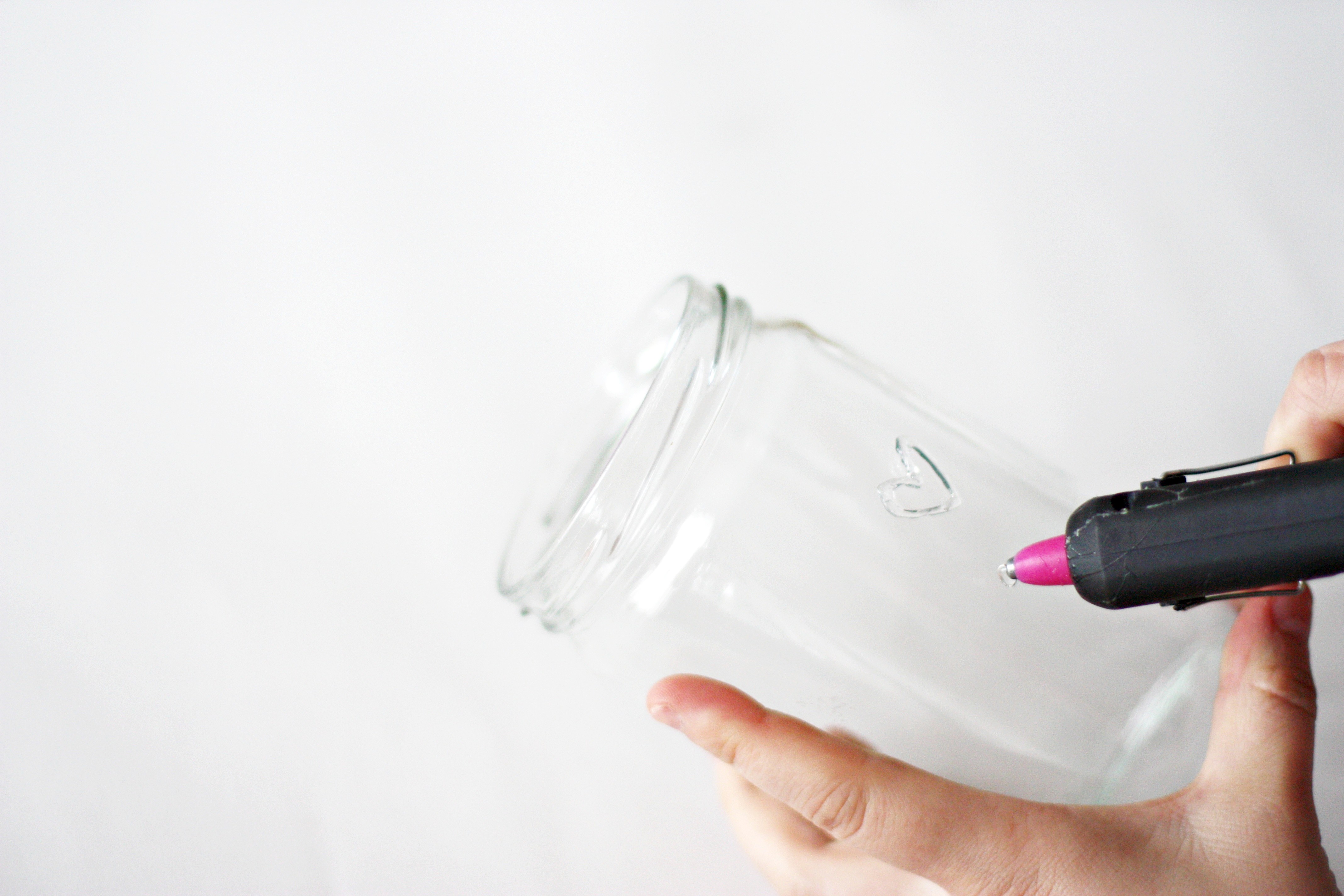Étape 2 : Si votre bocal n’a pas de relief déjà inscrit (Le Parfait, Mason Jarr, Ball ou Kerr par exemple), écrivez votre petit mot avec un pistolet à colle. Jusque là rien de compliqué.