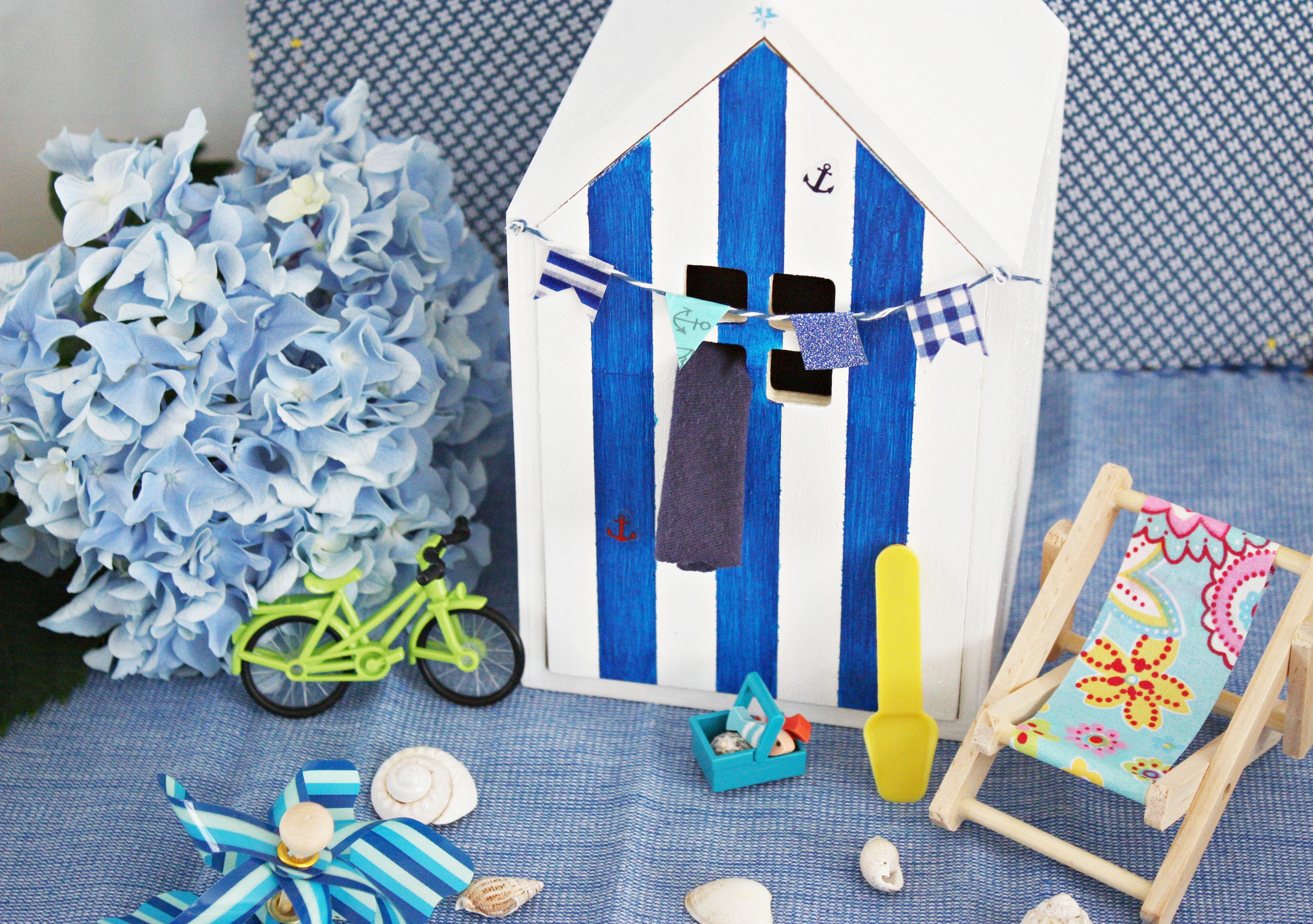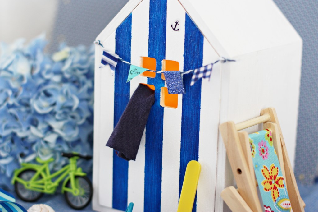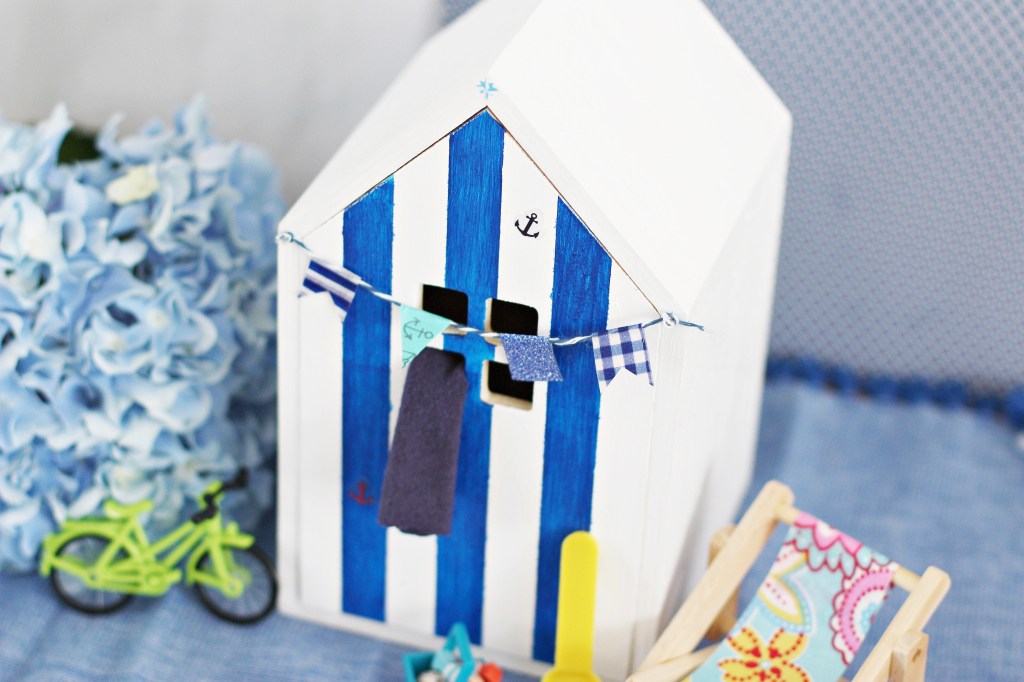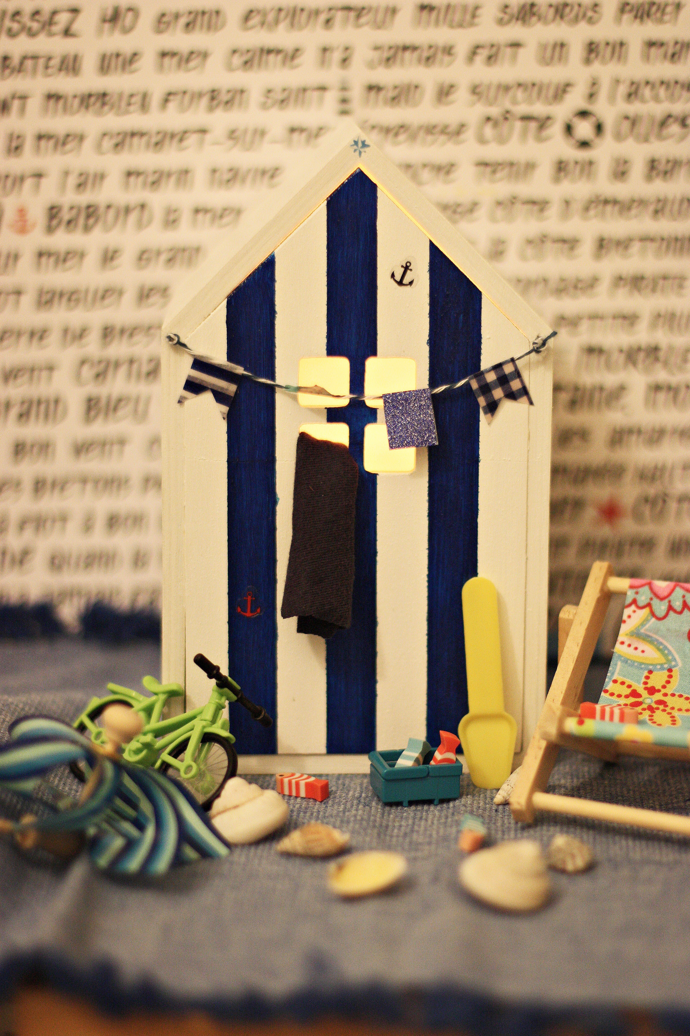 Je me suis demandée qu’est-ce qui caractérisait le plus la plage et c’est forcément ces petites cabines à rayures. J’ai trouvé une petite maison à tiroir en promo chez Cultura et elle est vraiment parfaite. Ni trop petite, ni trop imposante j’ai décidé d’en faire une petite veilleuse pour y cacher ses trouvailles.