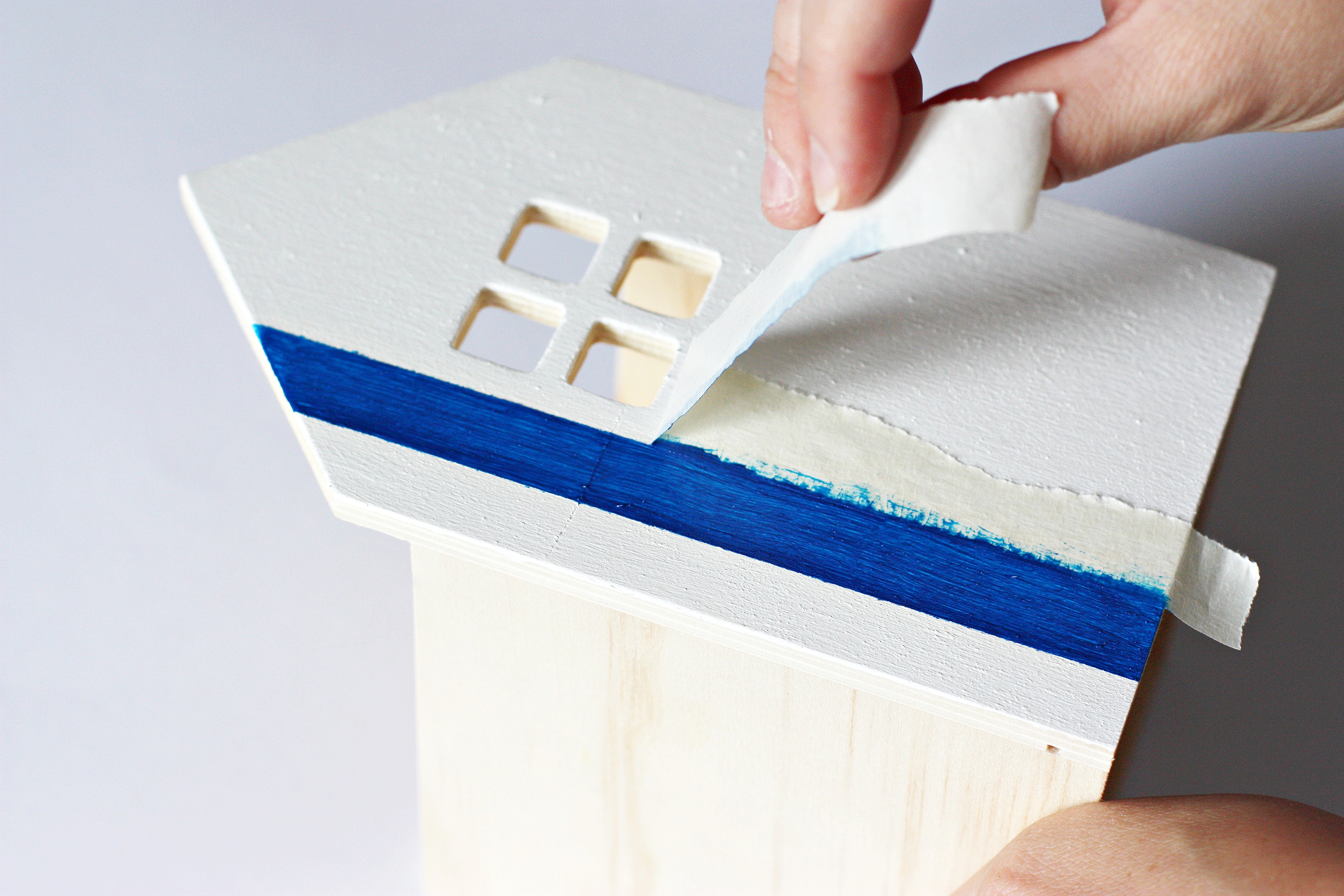 Étape 4 : Une fois la peinture blanche sèche, on va passer à la bleu pour réaliser des rayures (assez caractéristiques des cabines de plage) mais juste sur la « porte ». Prenez votre ruban de masquage et réalisez les bandes selon la grosseur que vous souhaitez.