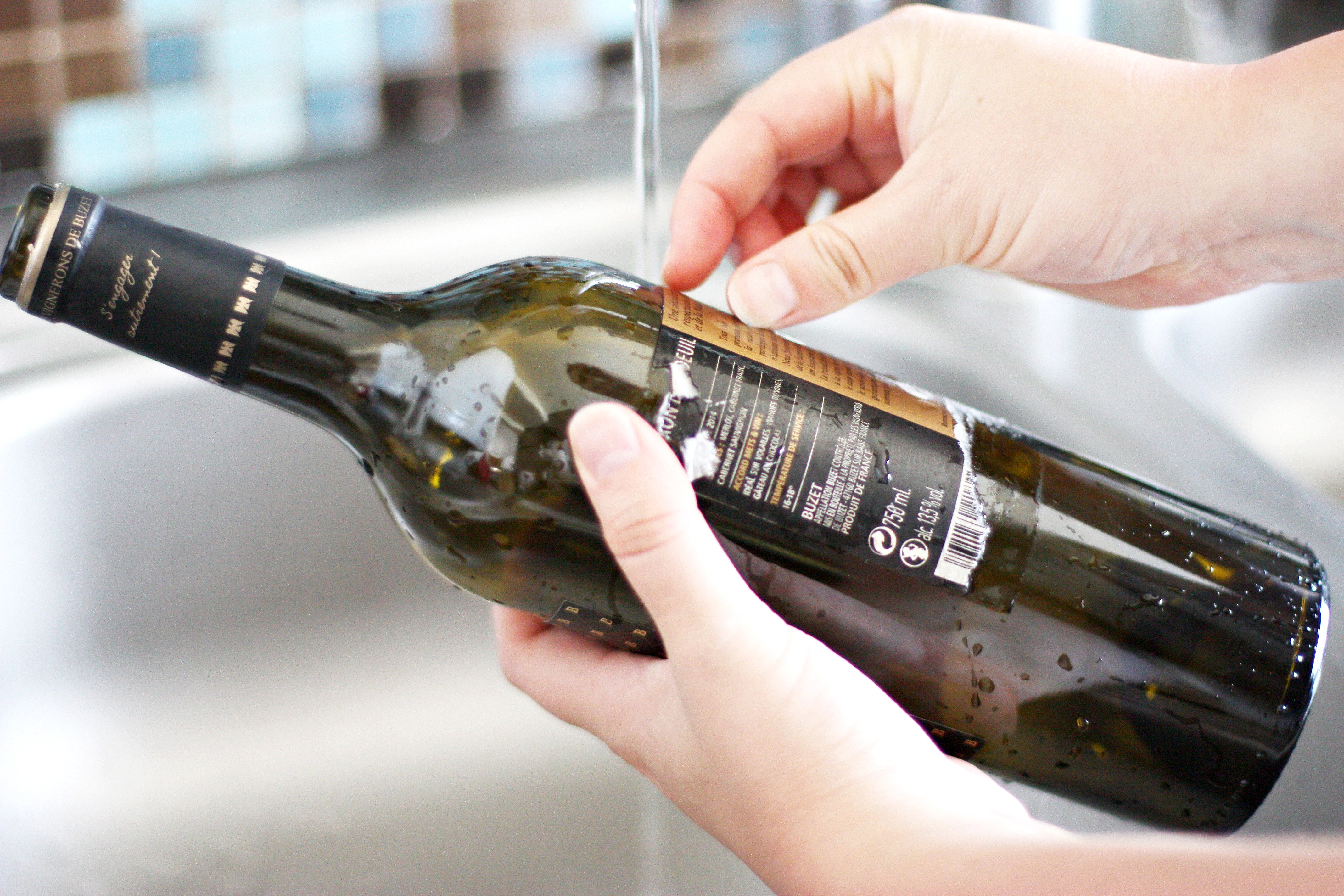 Étape 1 : Tout d’abord, lavez votre bouteille et enlevez les étiquettes si vous ne souhaitez pas les garder.