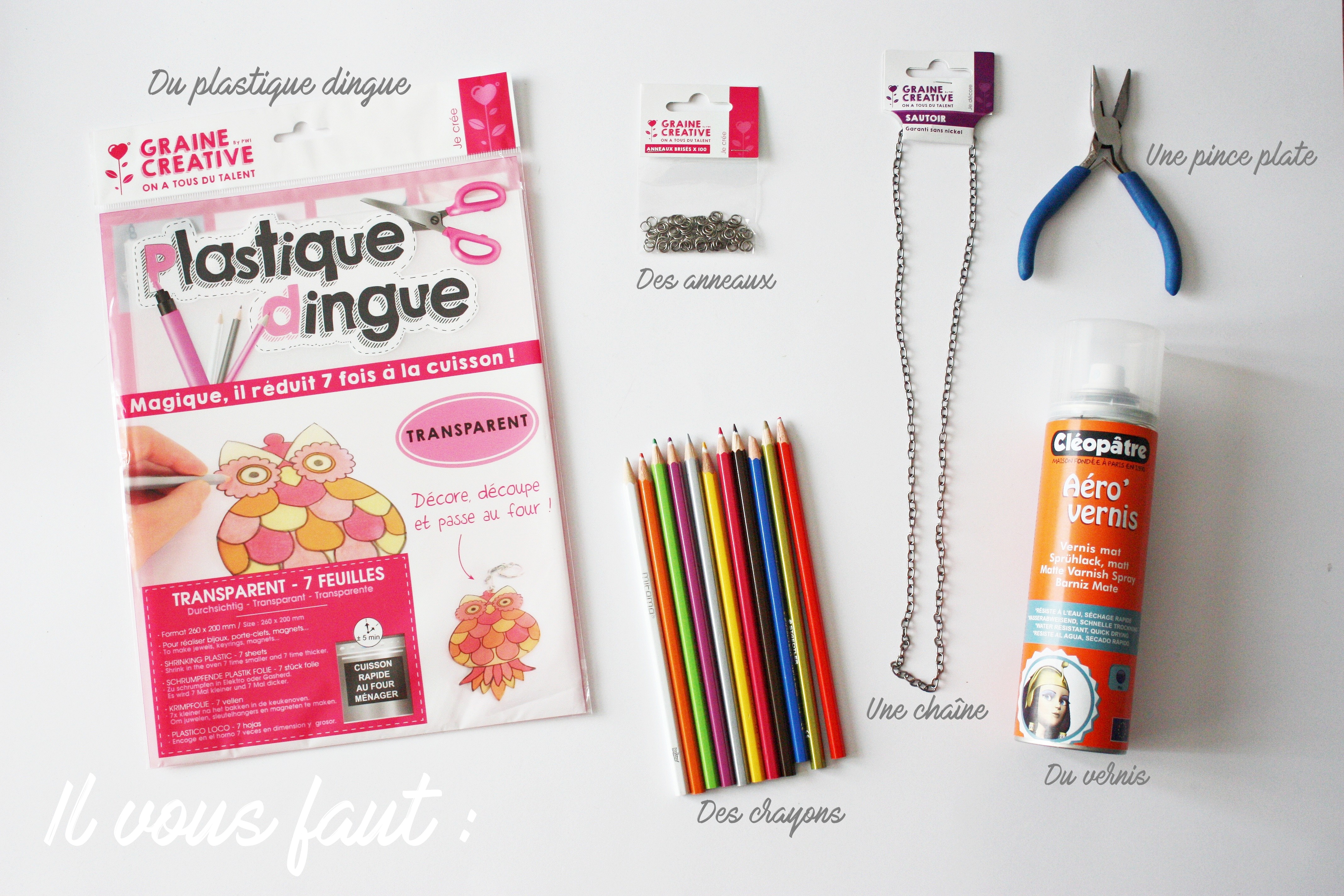 Tous les articles (anneaux, chaîne, plastique dingue) ont été fournis par la marque Graine Créative pour le challenge et je suis ravie de faire partie des participantes. J’ai pu me re-familiariser avec la technique, expérimenter la cuisson au four et voir les débuts plutôt laborieux.