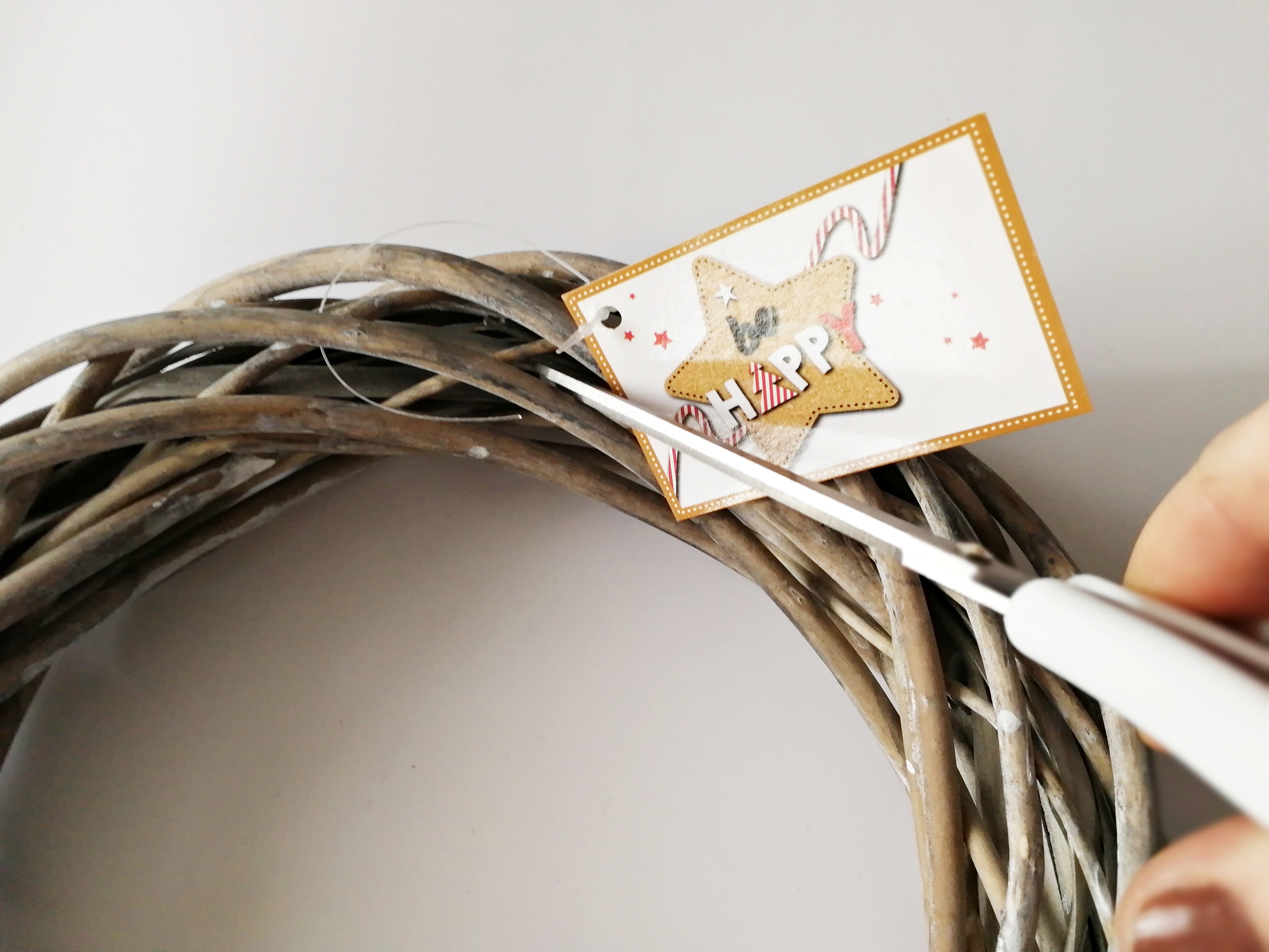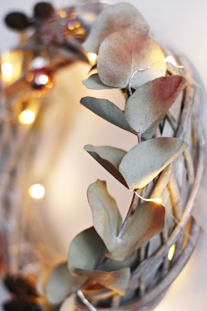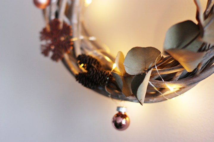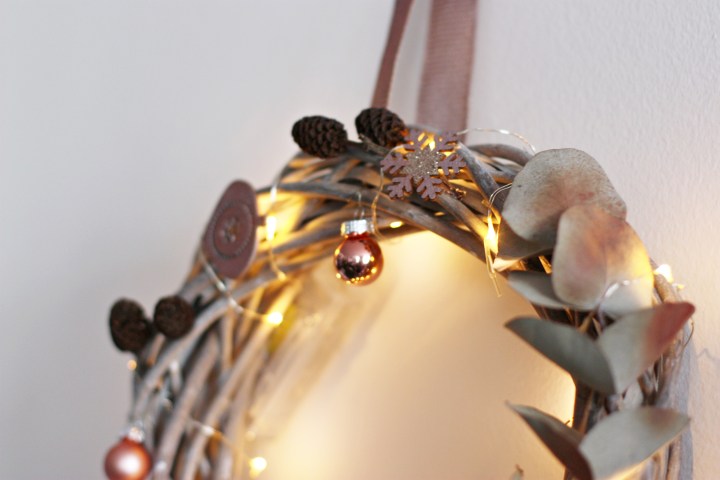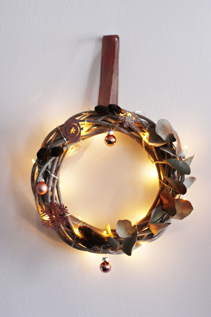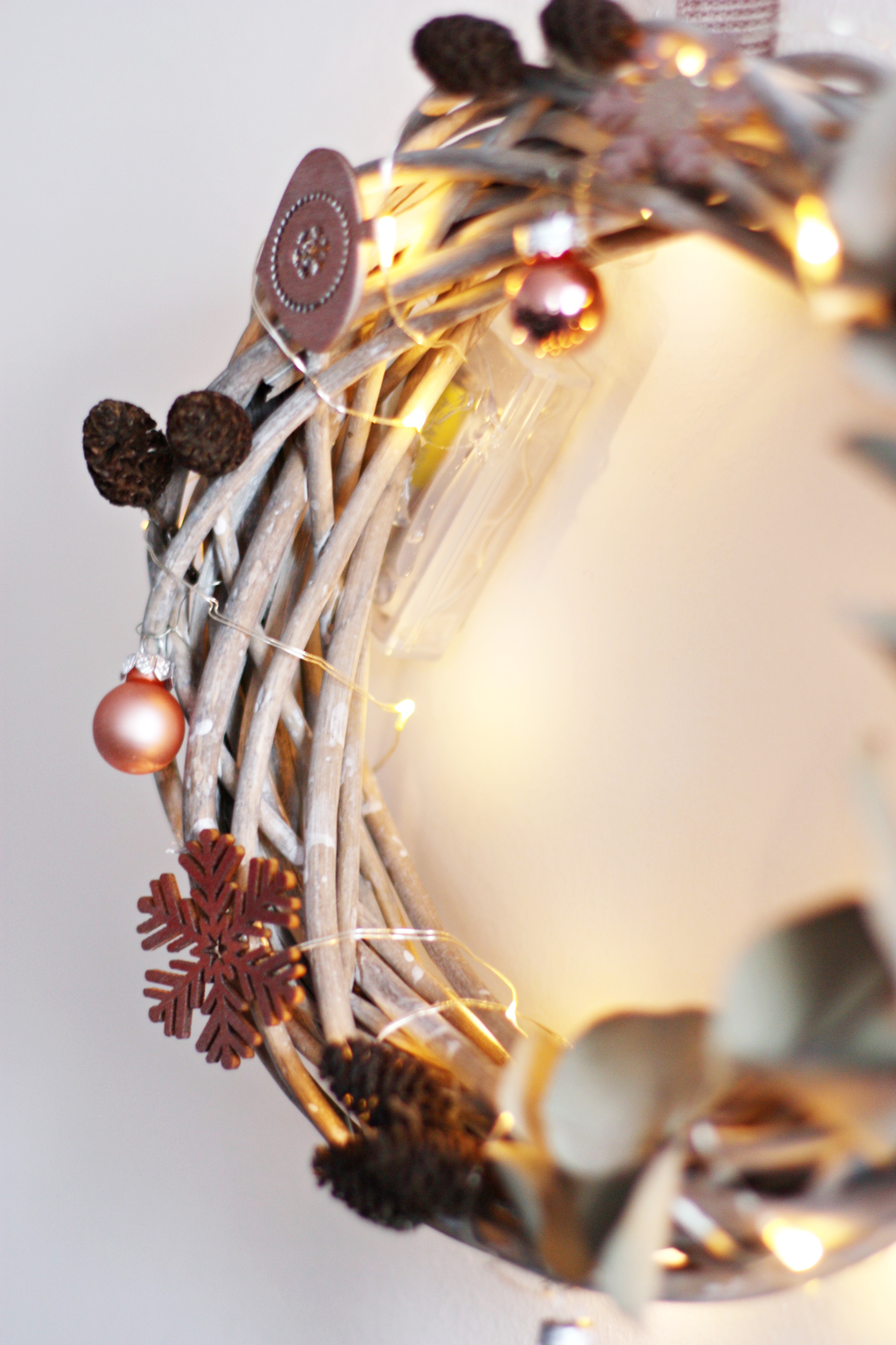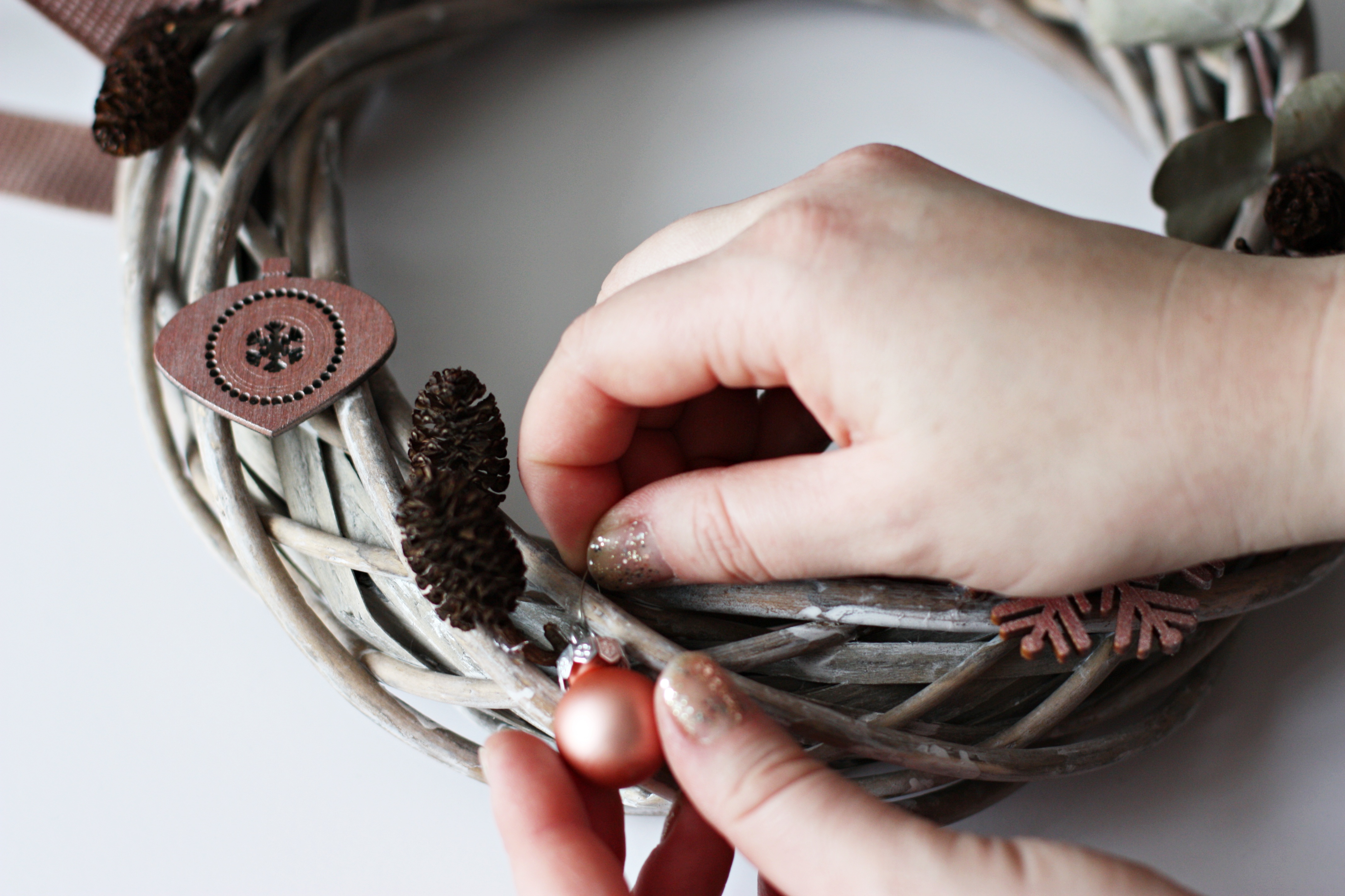 Vous pouvez compléter votre couronne avec d’autres décorations si le cœur vous en dit. J’ai eu envie de mettre quelques boules en verre que j’ai trouvé chez Søstrene Grene.