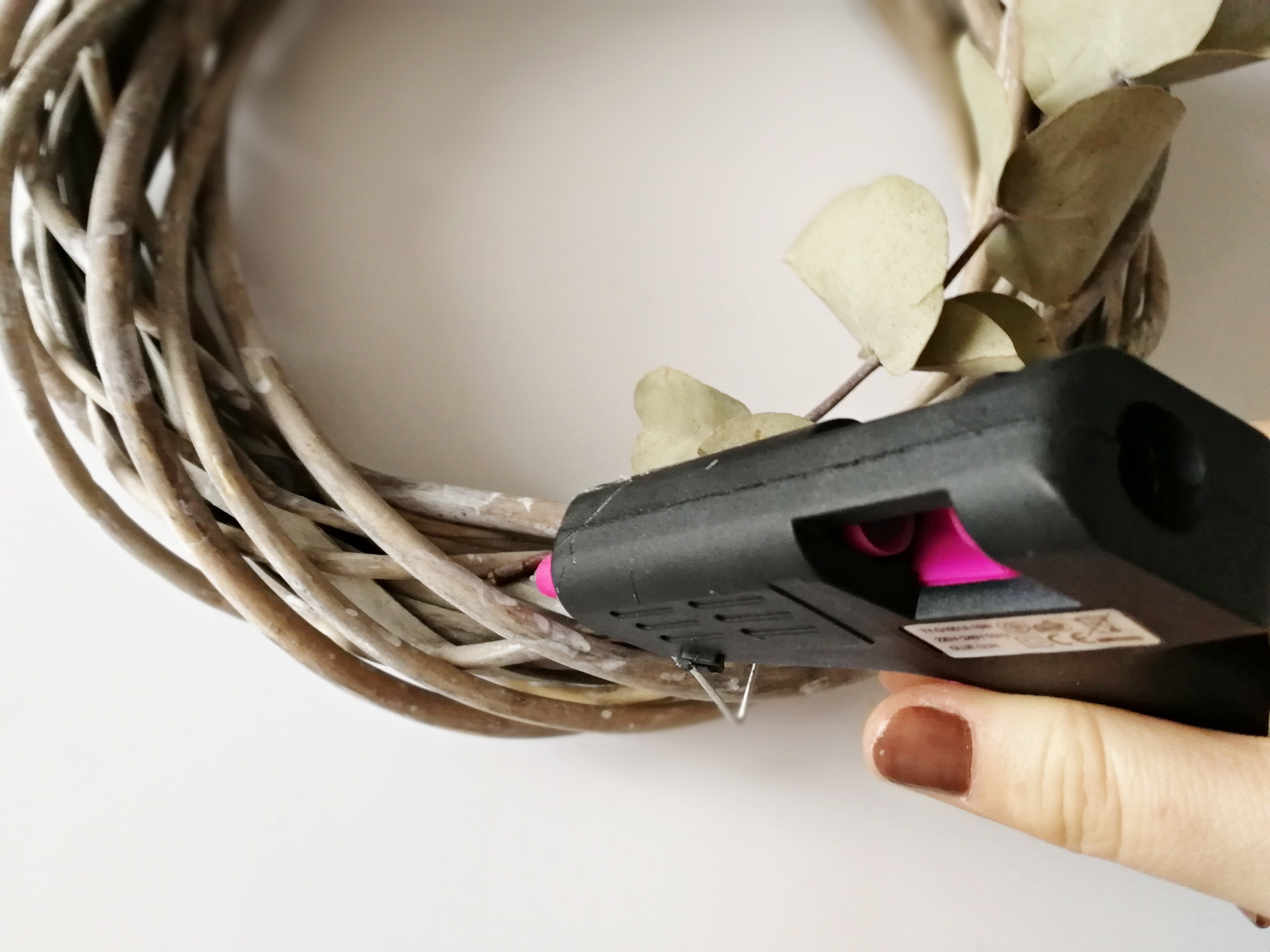 Étape 2 : À l’aide de votre pistolet à colle chaude, collez votre branche d’eucalyptus sur l’un des côtés de votre couronne.