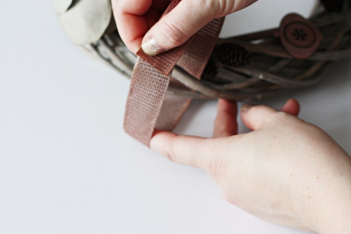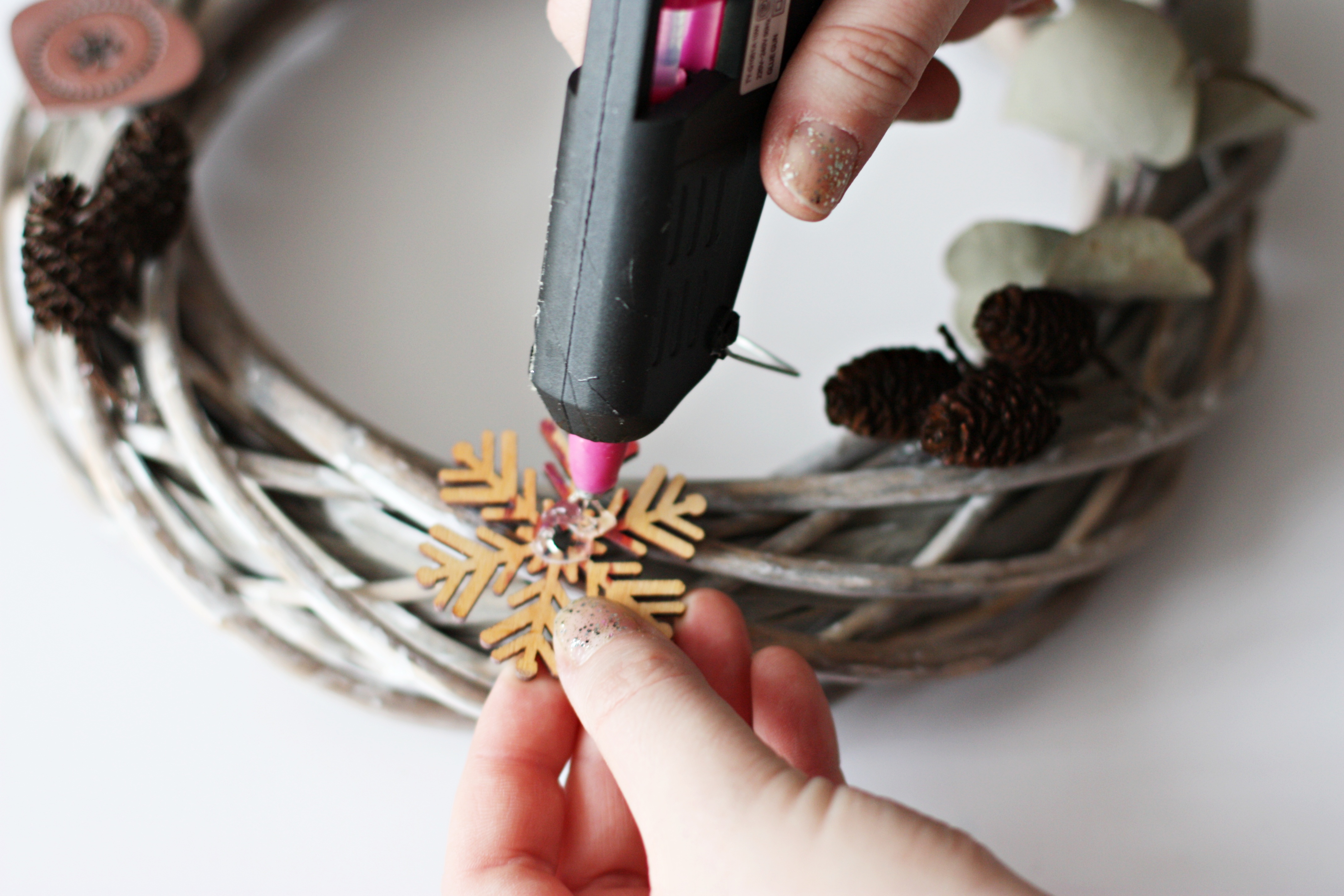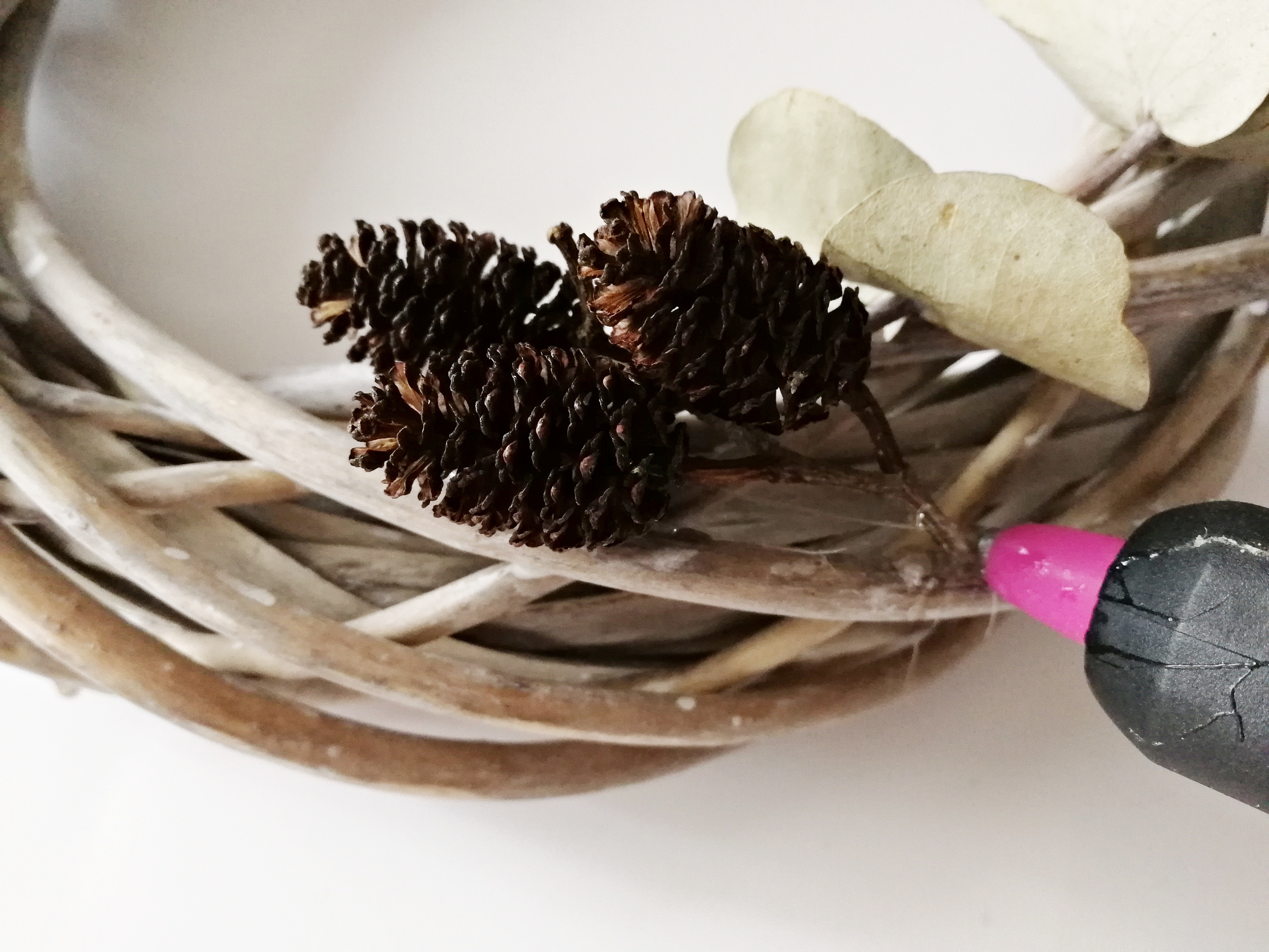 Étape 3 : Collez vos boules de pin et autres décorations en bois, toujours à l’aide de votre pistolet à colle.