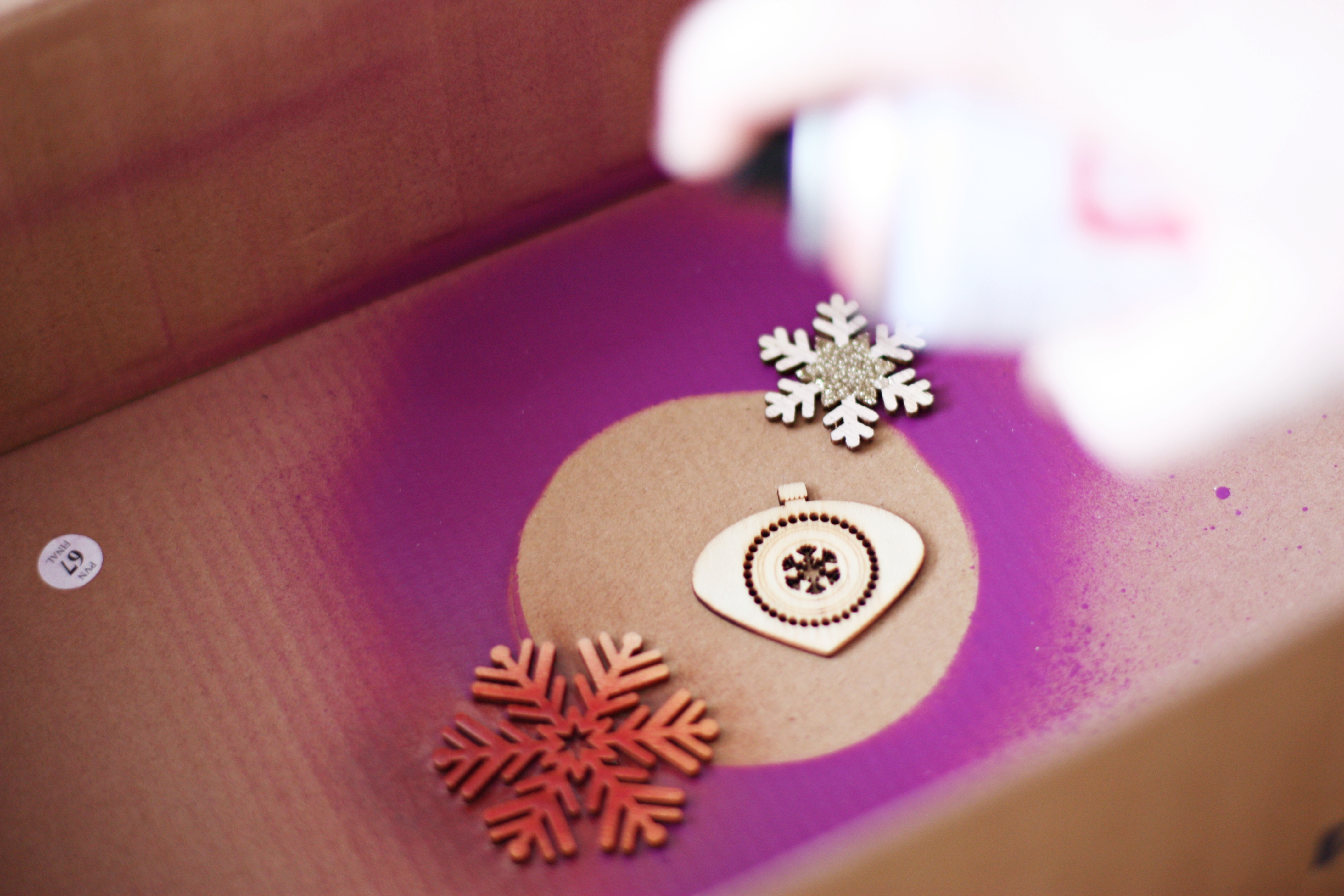 Étape 5 : Sélectionnez vos formes en bois Toga et mettez-les dans un carton pour pouvoir les bomber. Après avoir bien secoué la bombe, j’ai bombé mes flocons en bois à environ 20 cm de distance pour éviter les coulures et les traces.