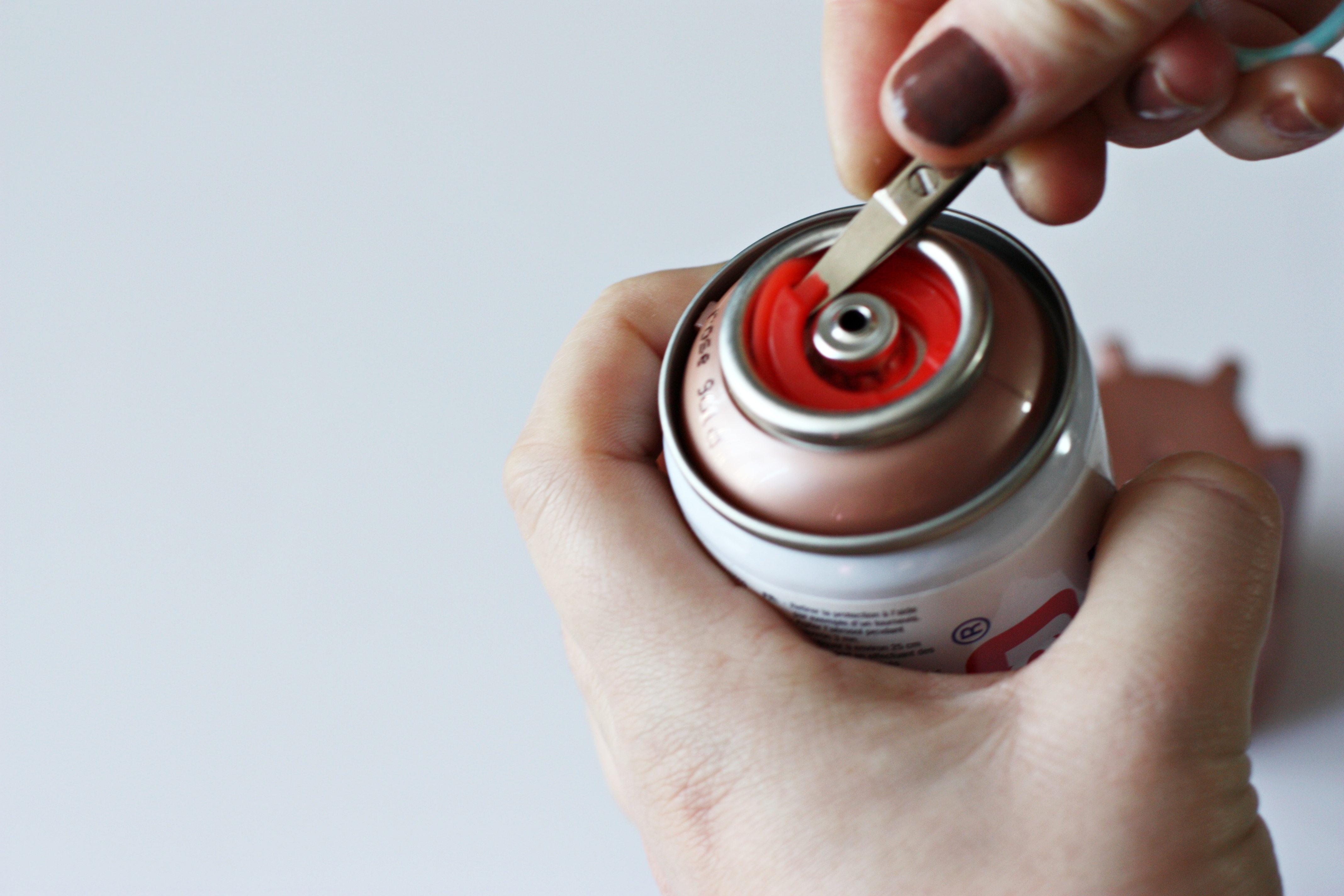 Étape 4 : Enlever votre sécurité (qui se trouve en dessous de la buse) sur la bombe de peinture Edding à l’aide d’un petit tournevis ou de ciseaux fins. Et remettez la buse en place.