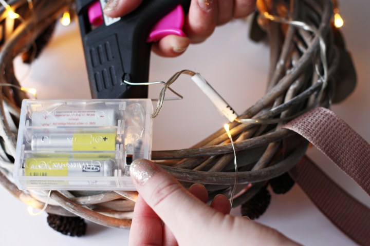 Étape 8 : Passez votre guirlande autour du bois et fixez la boîte à piles derrière.