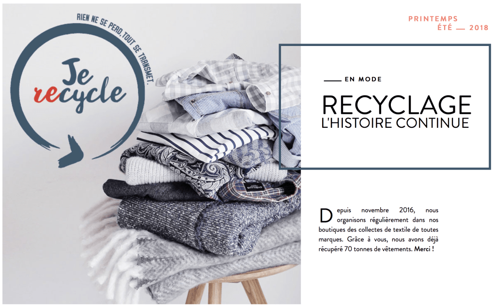 Cette année, l’enseigne lance, elle aussi, une opération de recyclage éphémère. Malheureusement je l’ai loupé, l’opération a eu lieu du 26 février au 3 mars 2018 inclus et permettait de rapporter les vêtements troués ou tâchés dont on ne sait pas quoi faire ainsi que les sous-vêtements, les chaussures liées par paire et la maroquinerie. La seule condition c’est qu’ils doivent être propres et secs pour être déposés.