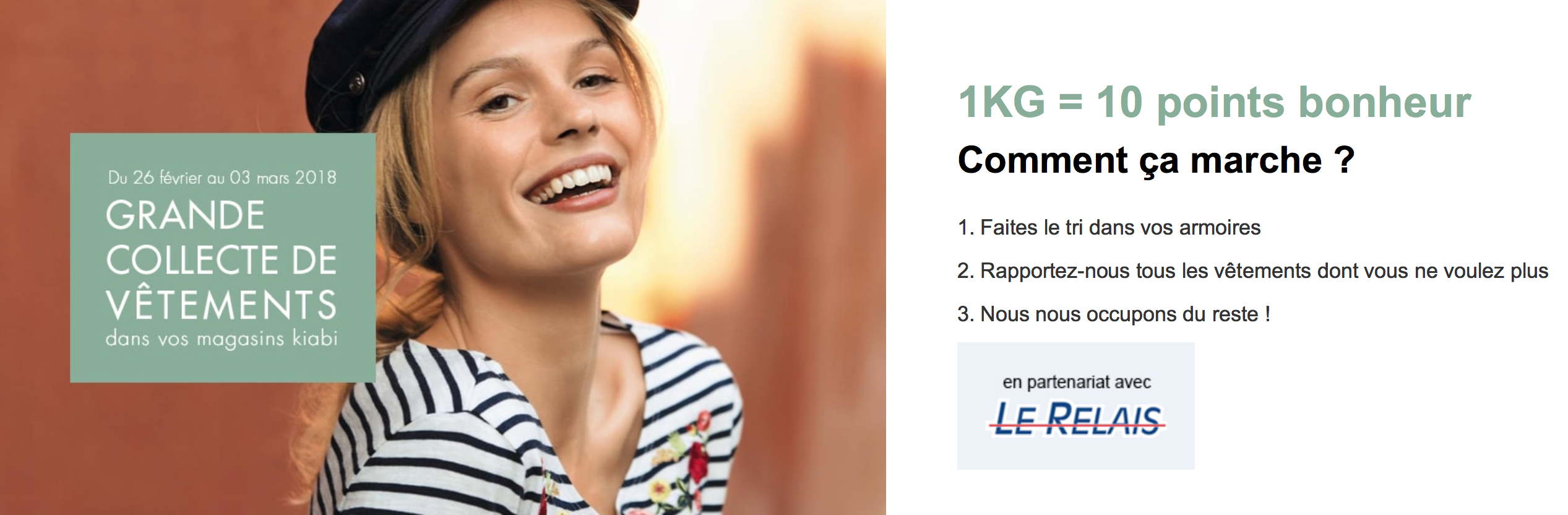 Pour 1 Kg de vêtements rapportés, Kiabi vous offre en échange 10 points bonheur crédités sur votre carte fidélité. Les vêtements sont traités par l’entreprise Le Relais afin d’être triés, recyclés ou réutilisés et grâce au tri, l’entreprise génère des emplois pour des personnes sous contrats d’insertion.