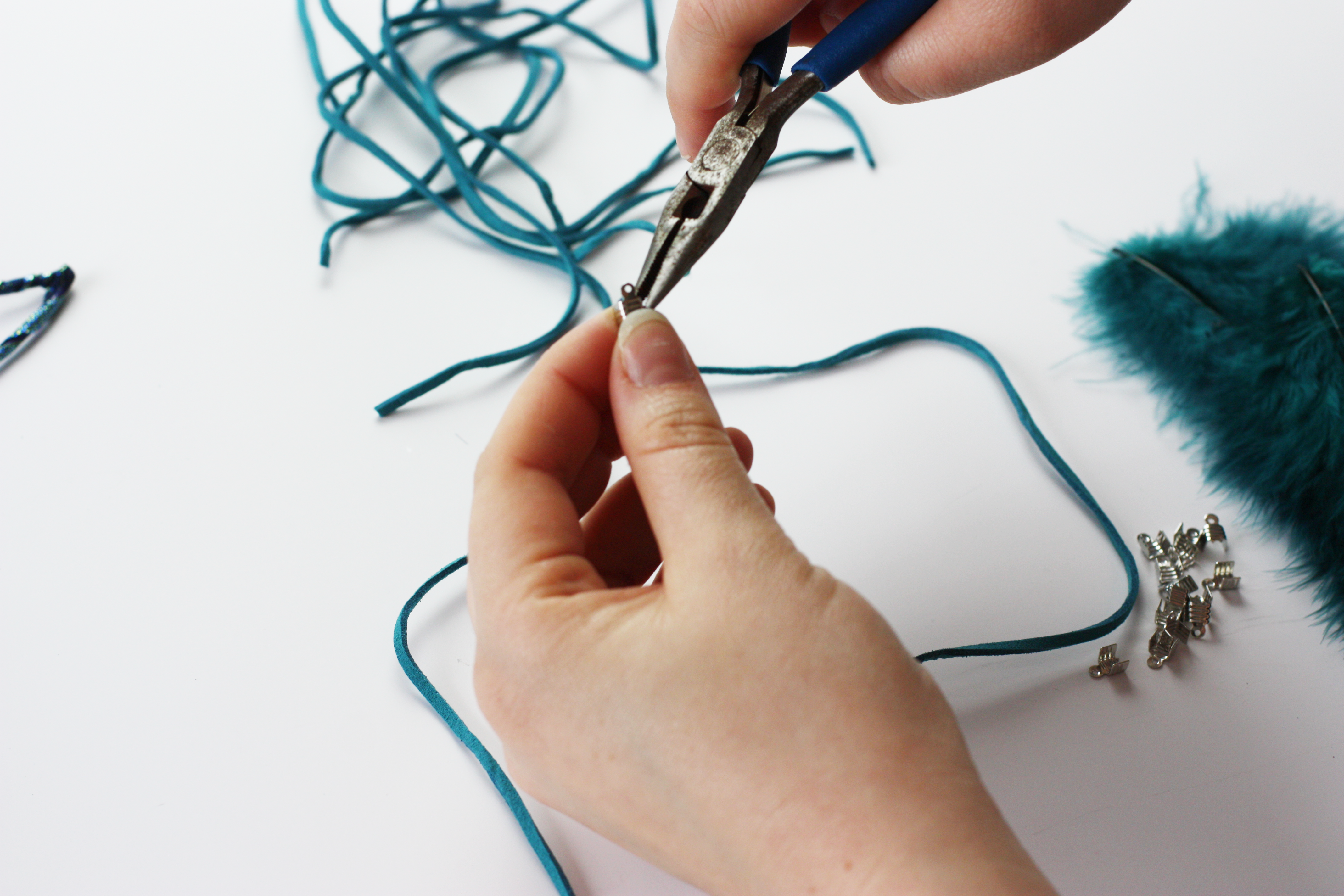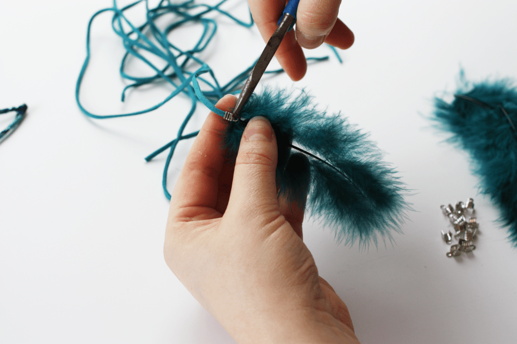 Étape 5 : A l’aide d’une pince plate, aplatissez bien pour maintenir la plume et la suédine ensemble.