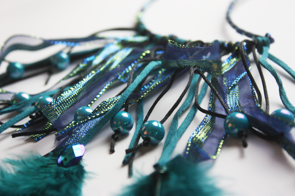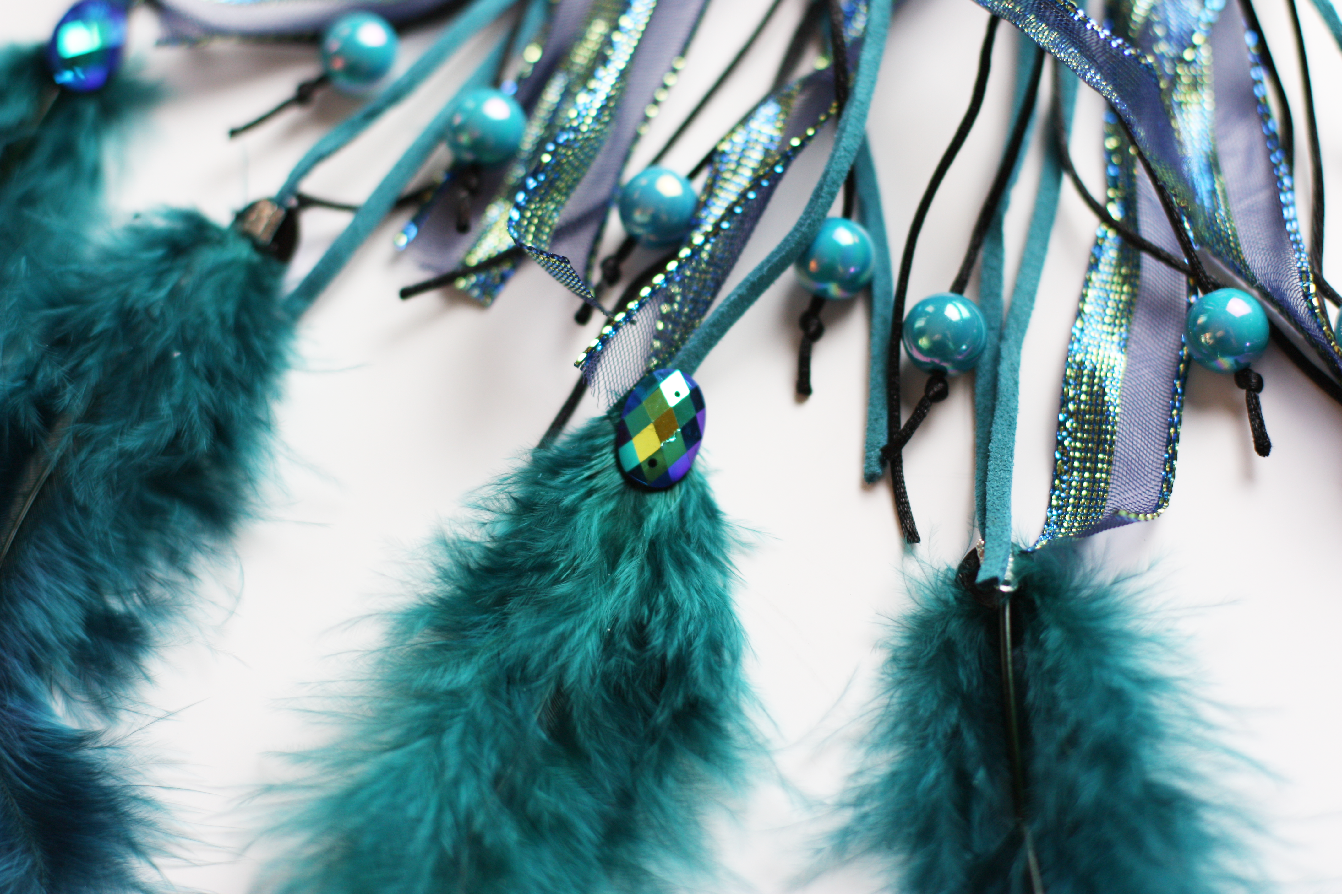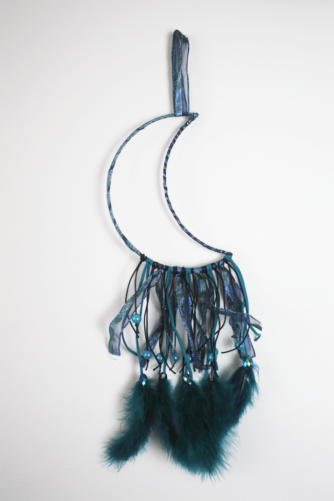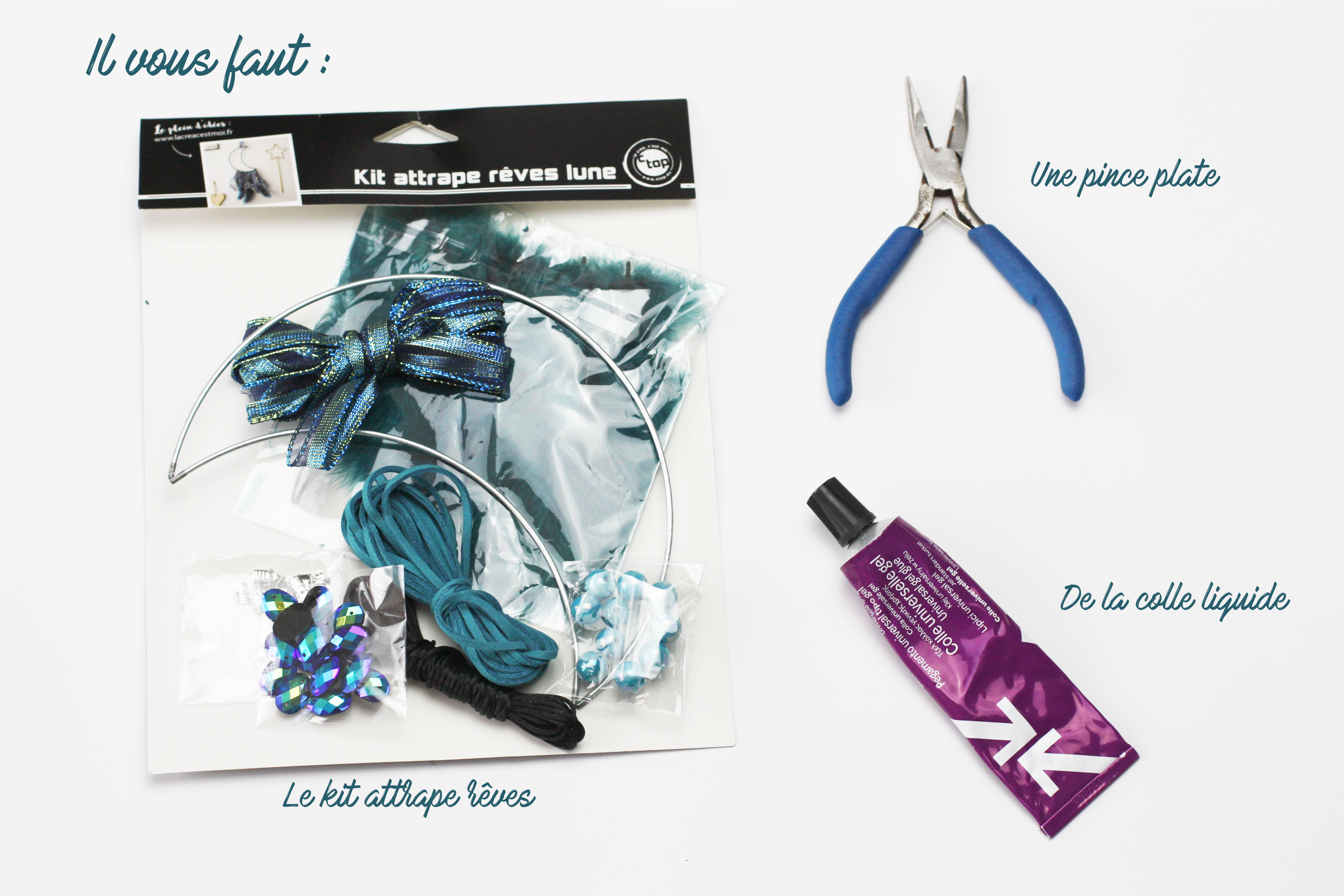 Quand je l’ai vu dans le magasin j’ai d’abord craqué pour sa forme originale. Ça change des traditionnels dreamcatchers que l’on voit sur les réseaux et la couleur bleue-verte du kit est magnifique. Pour 5€99, tout est fourni à l’intérieur, vous avez des fils (ruban, suédine et fil noir), des plumes de différentes tailles, des perles irisées, des perles facettées irisées, des embouts à plier et la forme lune en métal.