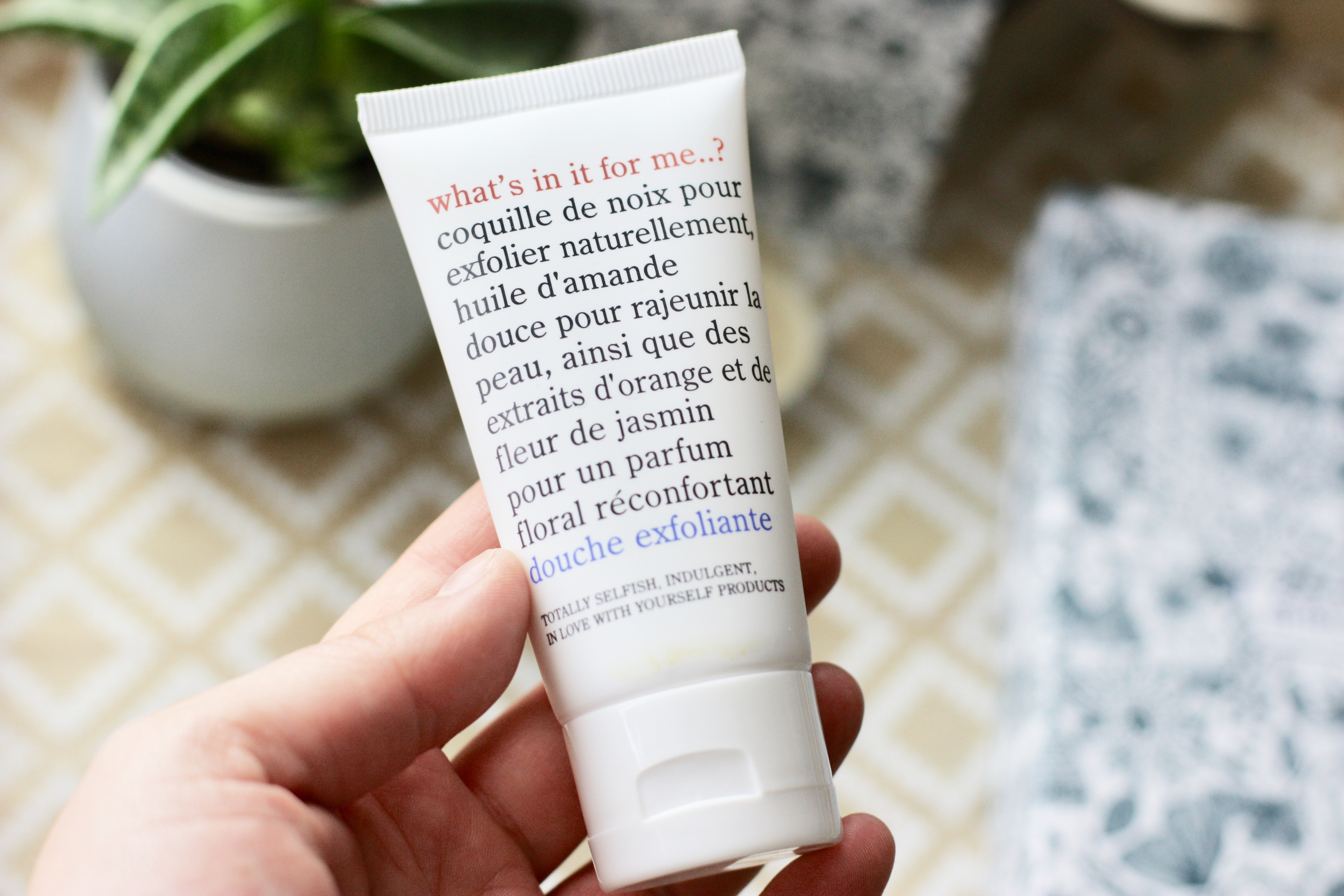 Enfin le dernier produit que j’ai reçu est le gommage de la marque What’s in it for me..? que je ne connaissais pas. Le packaging est ultra simple et si tu as un doute tout est écrit dessus. De la coquille de noix pour exfolier naturellement, de l’huile d’amande douce pour rajeunir la peau et des extraits d’orange et de jasmin pour un parfum floral réconfortant. Besoin de conseils pour l’utiliser ? idem rendez-vous au dos du packaging pour avoir la marche à suivre et les précautions d’emploi ainsi que la composition.