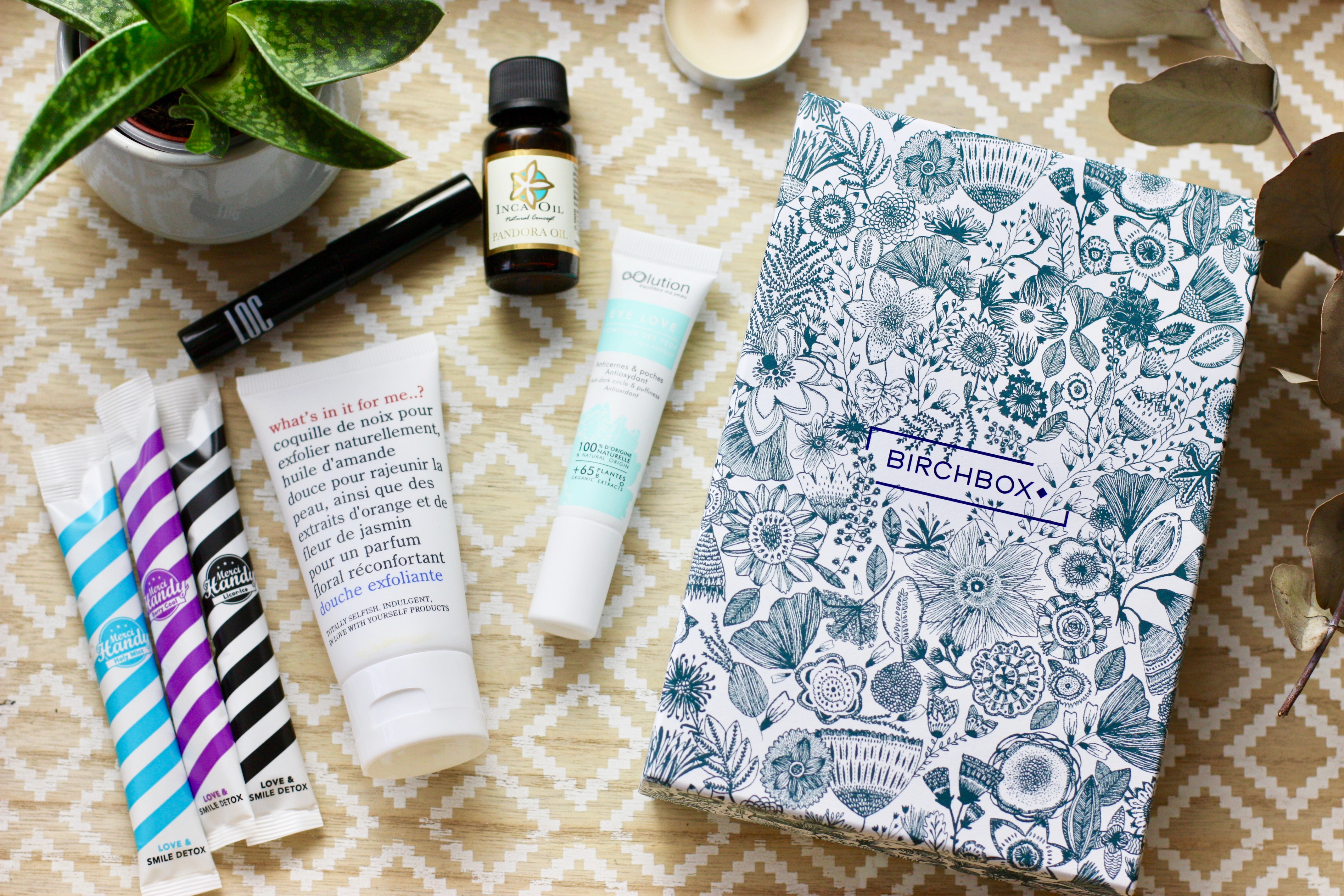 Sur la composition de la boîte, il y a encore des petites déceptions au niveau de la taille mais j’ai pu découvrir des produits que je connaissais pas et que je n’aurai pas acheté par moi-même comme le Smile Detox de Merci Handy ou encore le crayon ombre à paupière de LOC. La bonne surprise de cette édition est le soin anticernes de la marque oOlution. J’aime beaucoup le principe et l’éthique de cette marque, le produit est sans parfum et le packaging est relativement simple sans fioriture. Le gommage What’s in it for me..? est un gommage rien de plus basique mais remplit bien son rôle. Sa fragrance orange / jasmin est agréable et il exfolie mais sa composition laisse à désirer. Je suis contente car j’aurai pu encore recevoir le crayon marron de la marque Marcelle qui ne me sert strictement à rien et qui est dispo sur mon Vinted.