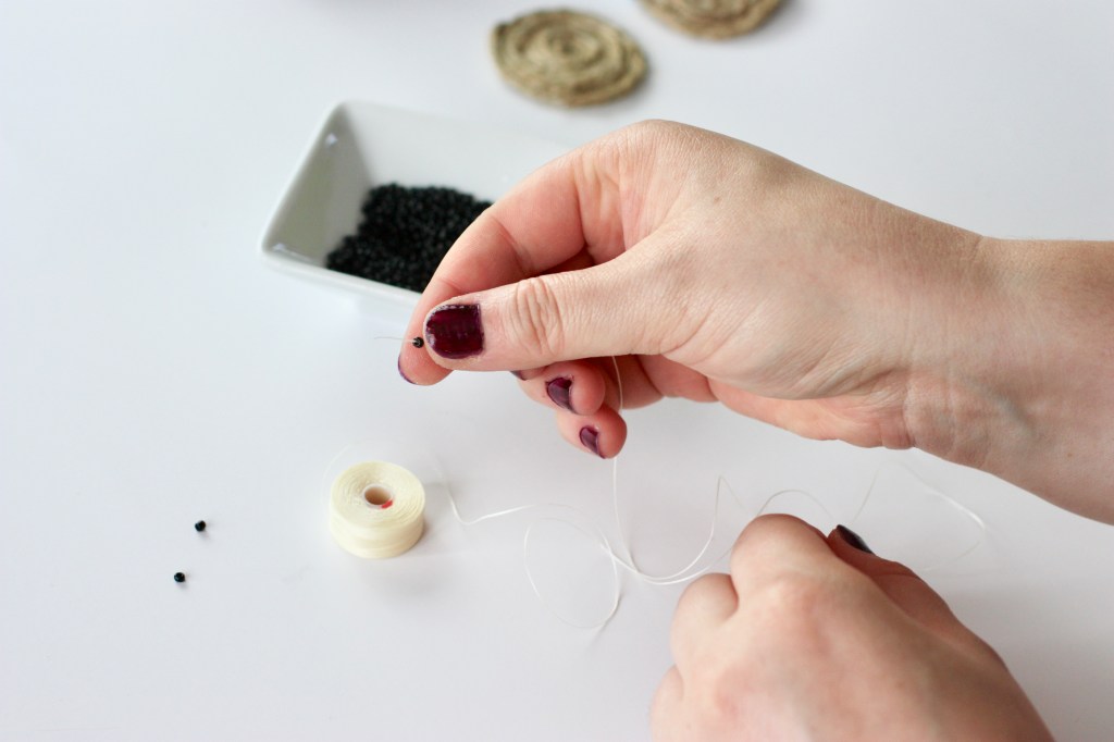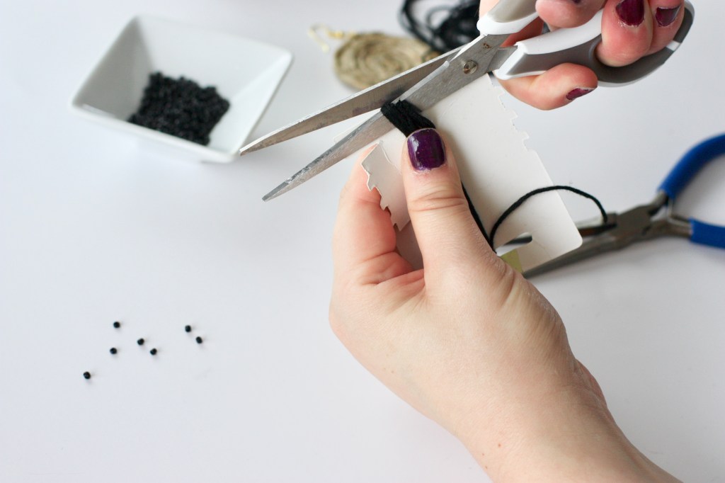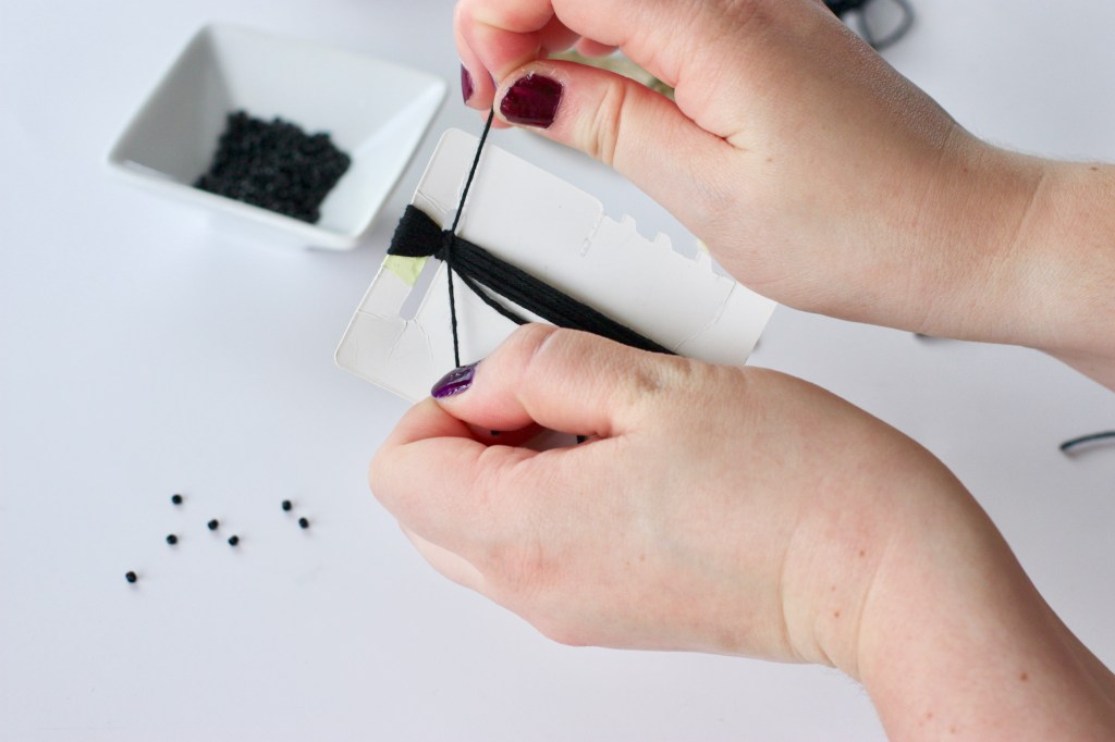 Étape 8 : On passe aux perles. Prenez votre fil et enfilez vos perles de rocailles selon la longueur choisie. Une fois terminé votre fil, faites deux noeuds aux extrémités. Répétez également l’opération pour la deuxième boucle.