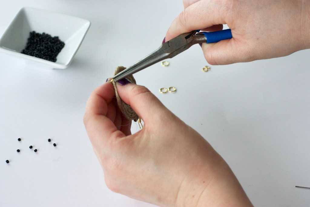 Étape 7 : Passez un anneau de 7mm dans votre pompon gland et dans l’anneaux de 0,6mm. À l’aide de votre pince, fermer l’anneau. Répétez l’opération 5 fois.