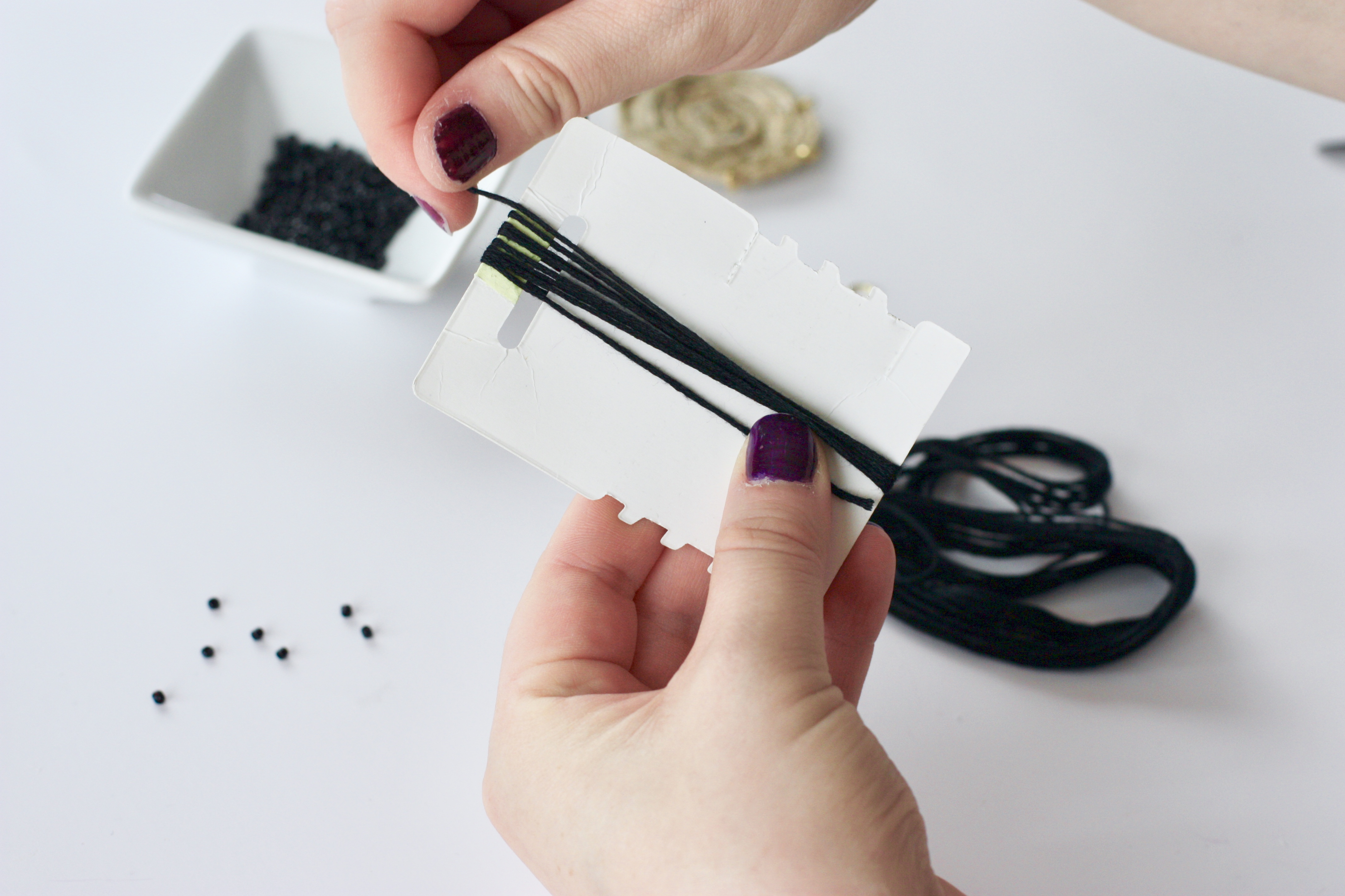 Étape 8 : On passe aux perles. Prenez votre fil et enfilez vos perles de rocailles selon la longueur choisie. Une fois terminé votre fil, faites deux noeuds aux extrémités. Répétez également l’opération pour la deuxième boucle.