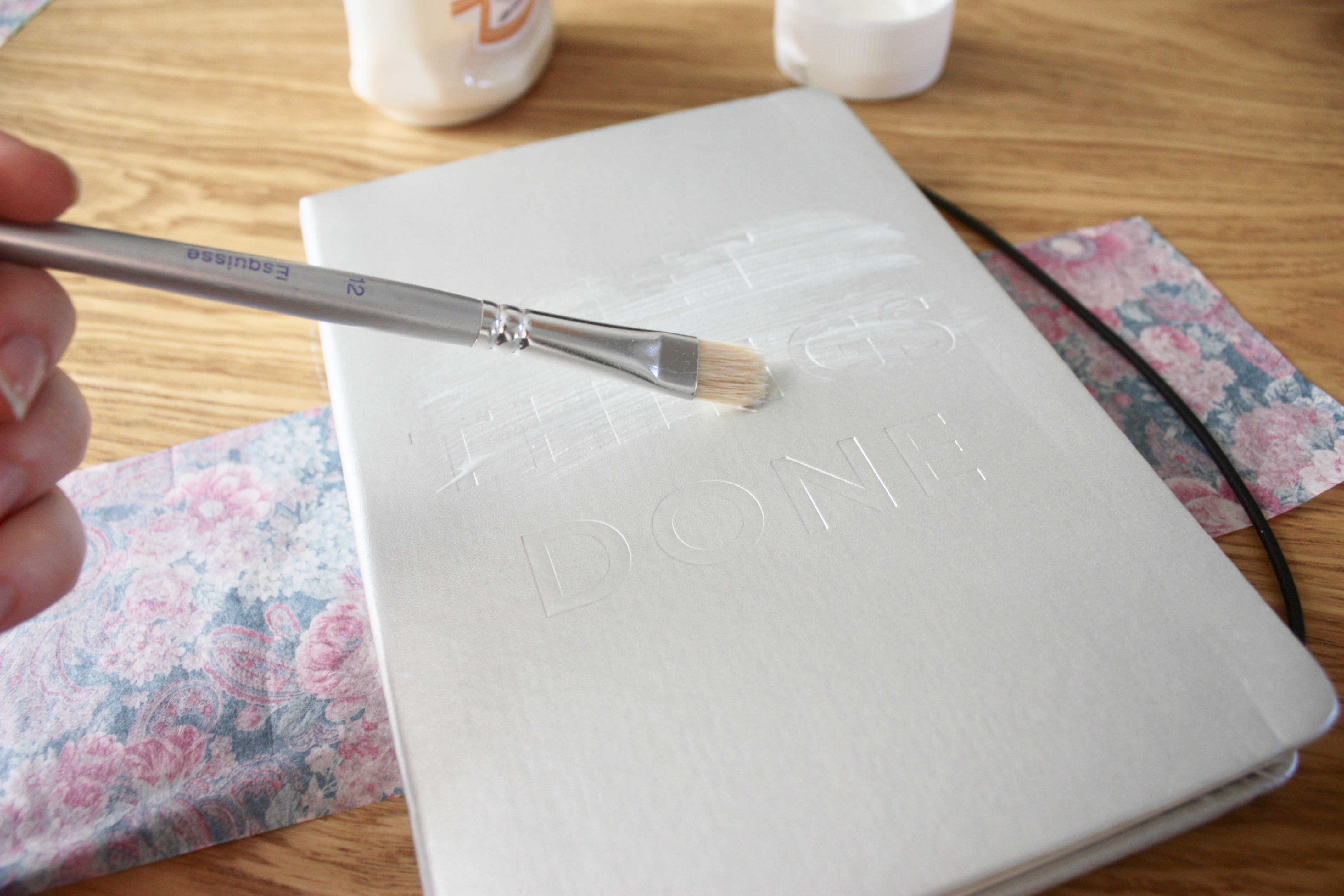 Étape 2 : Prenez votre vernis colle, votre pinceau et votre feuille de Décopatch. Badigeonnez votre couverture de colle et appliquez votre feuille de papier délicatement, lissez bien pour éviter les frisures.