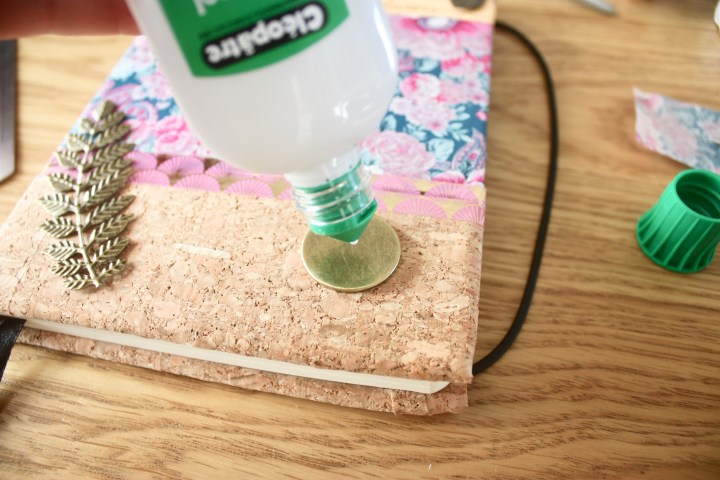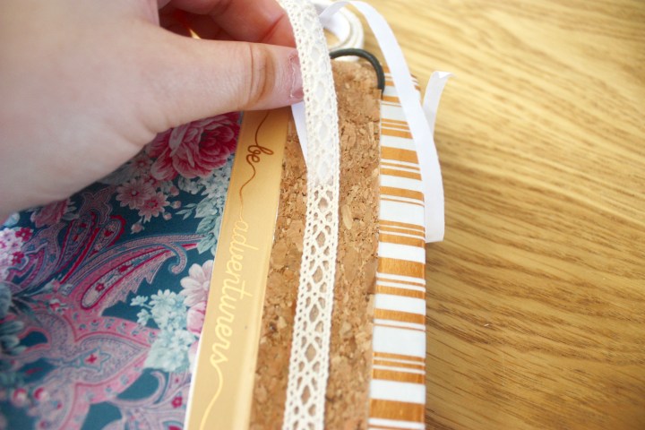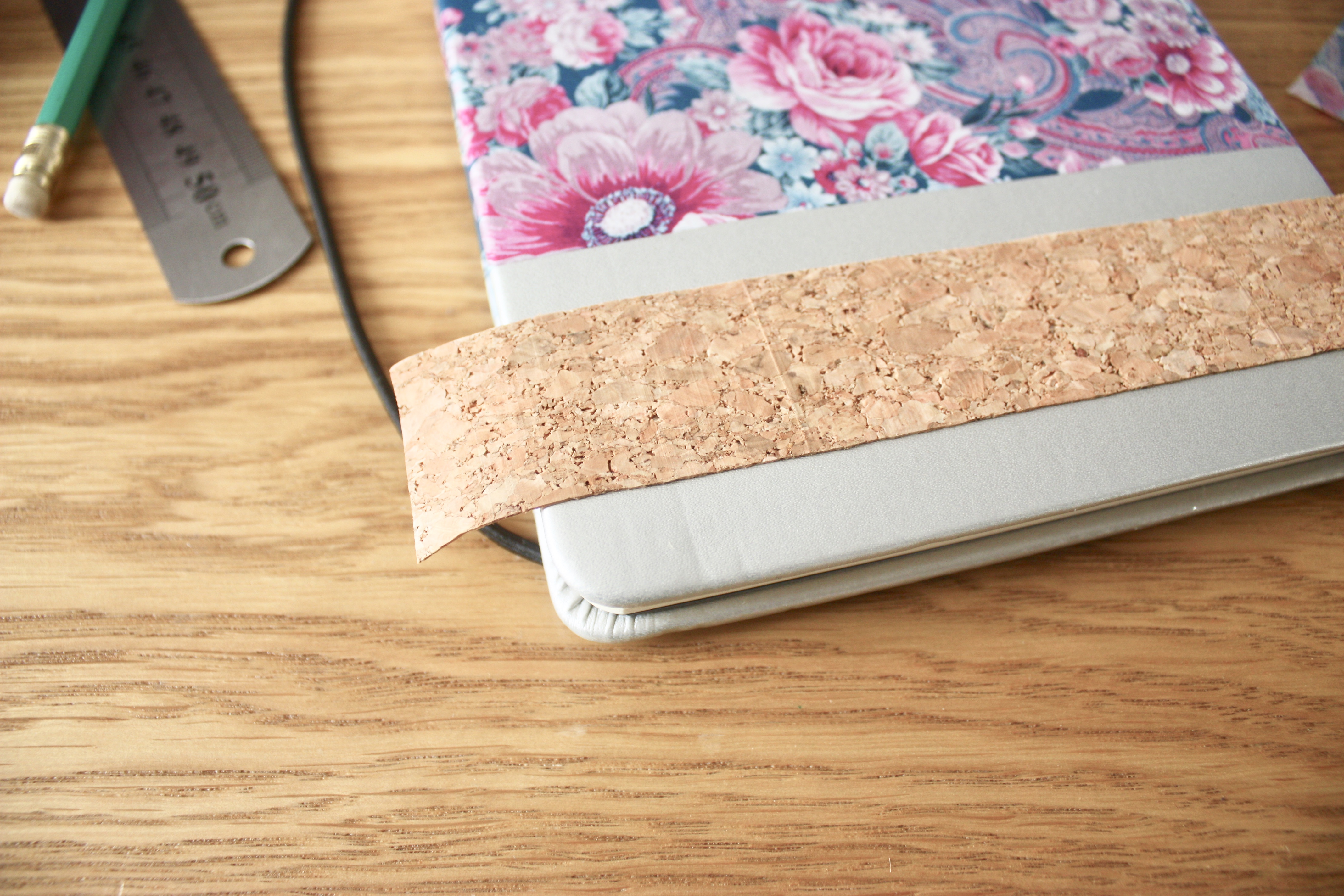 Étape 4 : Découpez des bandes de liège et collez-les sur votre couverture. J’ai eu de la chance, mon liège était autocollant, mais sinon de la colle liquide fera très bien l’affaire. Rabattez le reste à l’intérieur de la couverture.