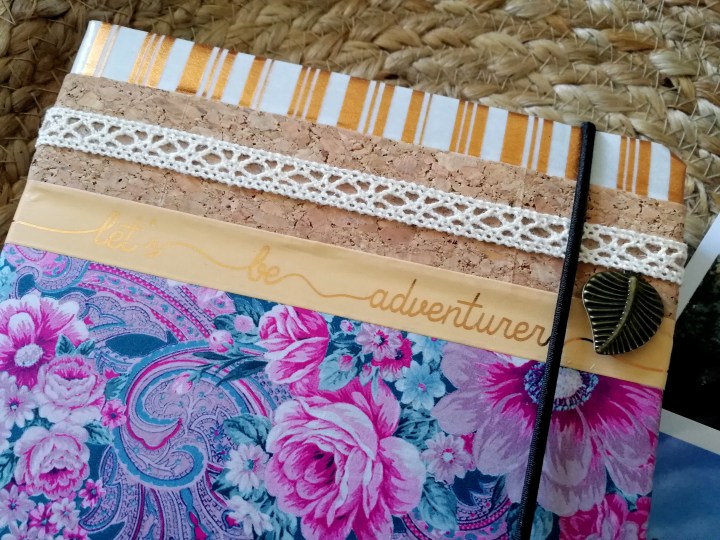 Étape 5 : Pour la décoration, j’ai alterné des bandes de masking tape et de tissu autocollant que j’ai déniché chez Action. Ces bandes pourront servir à agrémenter l’intérieur du carnet au fur et à mesure des escapades.