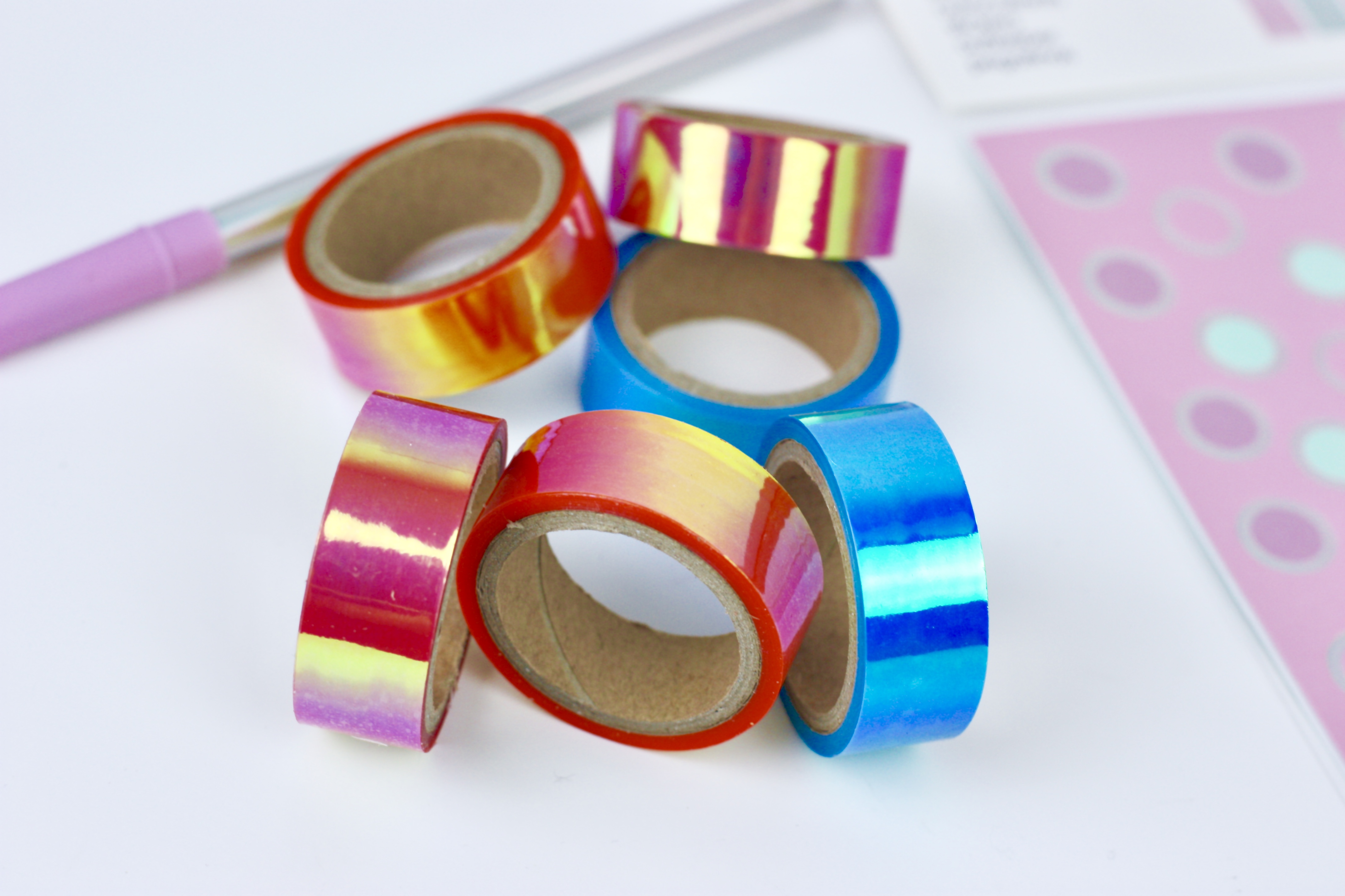 Pour commencer, voici un petit lot de washi tape aux motifs un peu old school. Ce paquet de trois rubans adhésif de 5 mètres est un parfait mélange entre le motif Memphis (année 80) et l’irisé, le pastel et la petite touche holographique que j’aime. Je n’ai pas résisté longtemps vu le prix dérisoire de 2,50€.