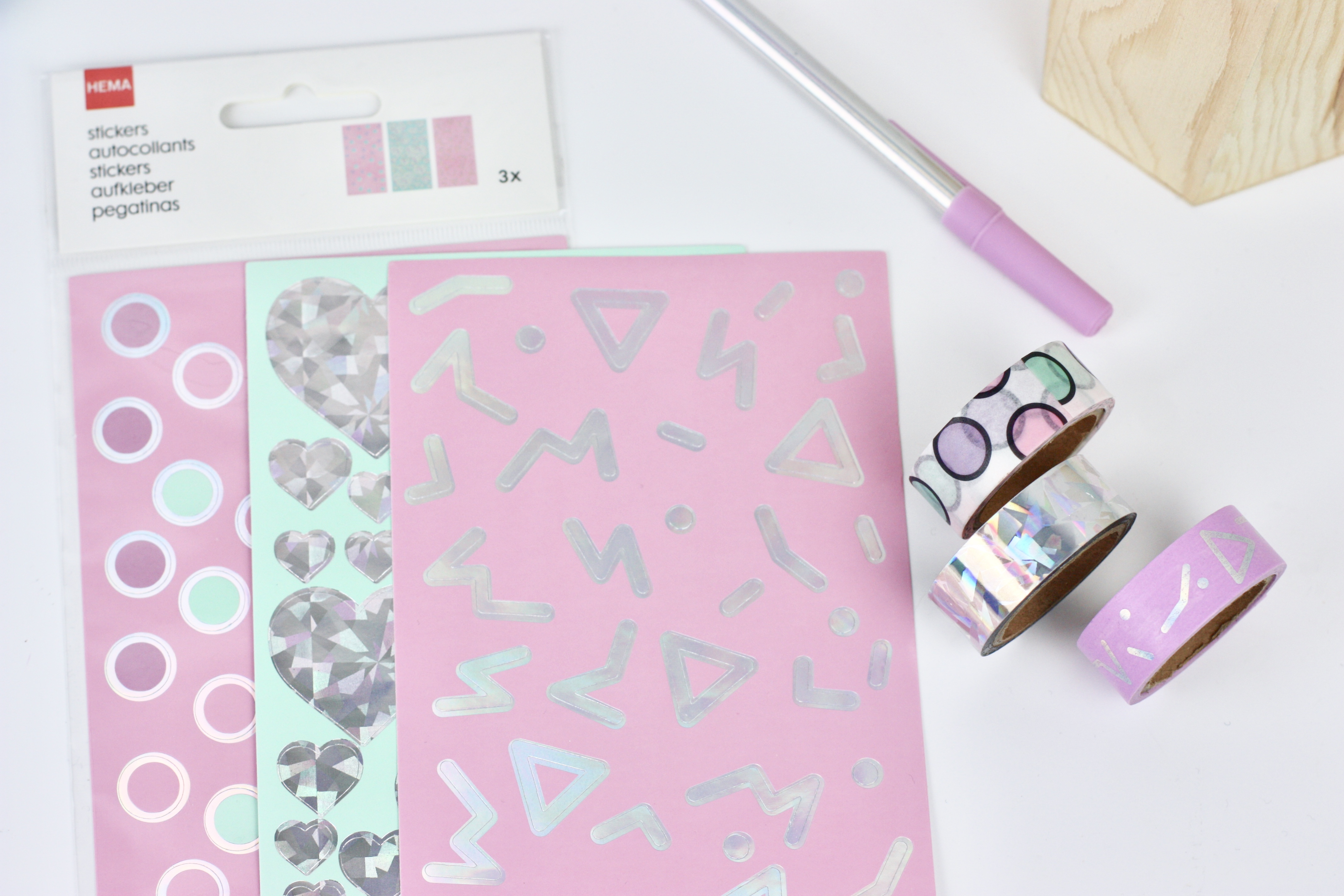 J’ai également pris un petit paquet d’autocollants dans la même gamme de motifs pastel/irisé. Dans le paquet, il y a 3 planches de 3 motifs différents : nous avons donc des pois, des coeurs et le fameux motif Memphis que j’adore tant. Aller pour 1,50€ le paquet, ce n’est pas grand chose et j’en trouverai l’utilité très vite, croyez-moi.