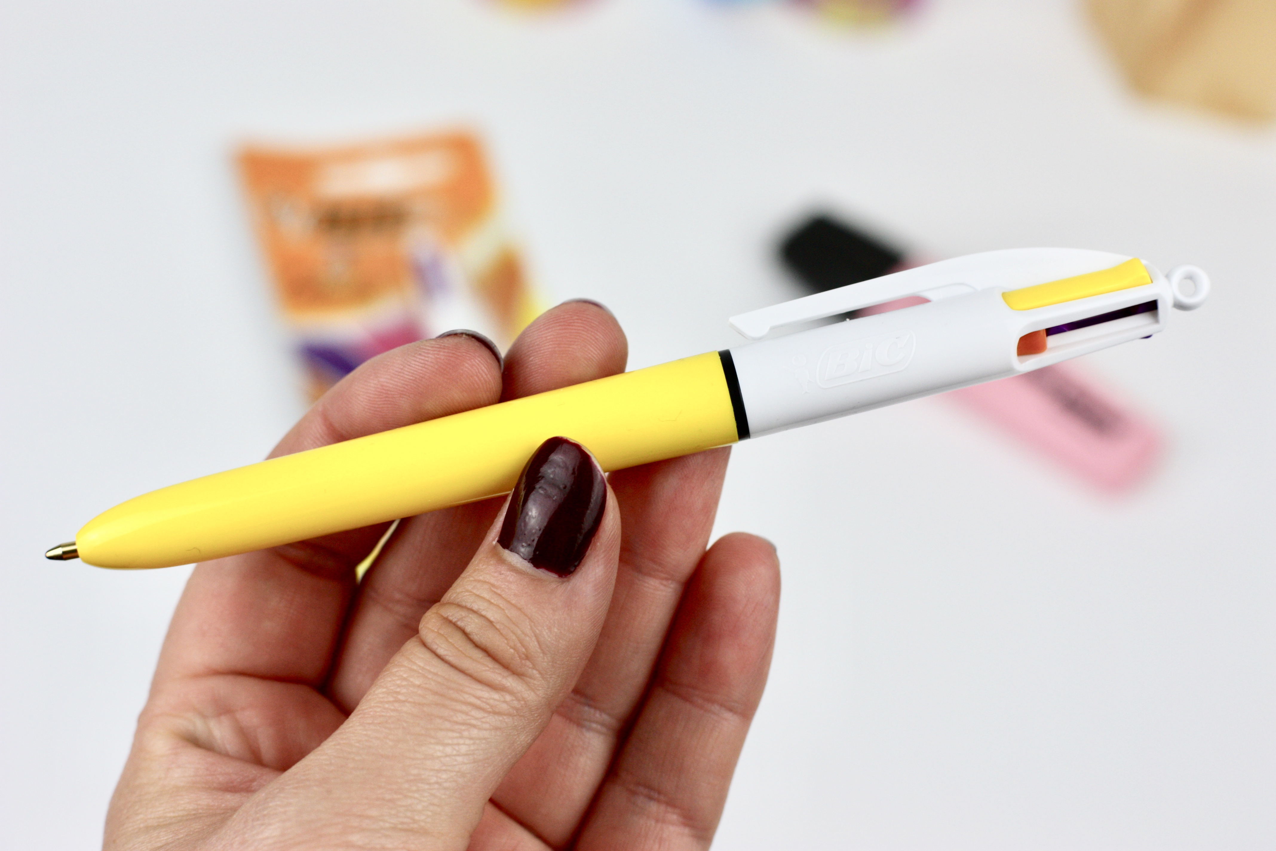 J’ai choisi un Bic 4 couleurs édition spéciale SUN avec 4 couleurs d’encres fantaisies et ensoleillées. Rien de mieux pour prolonger l’été ! Comme le 4 couleurs traditionnel, il y a 4 encres dans un stylo bille rétractable et la pointe de 1,0 mm pour une largeur de trait moyenne, jusque là rien de nouveau. La seule différence est que le stylo est jaune et que les teintes des encres sont plutôt pop. Nous avons jaune, rose, violet et orange. Ça ne sert strictement à rien mais moi j’adore !