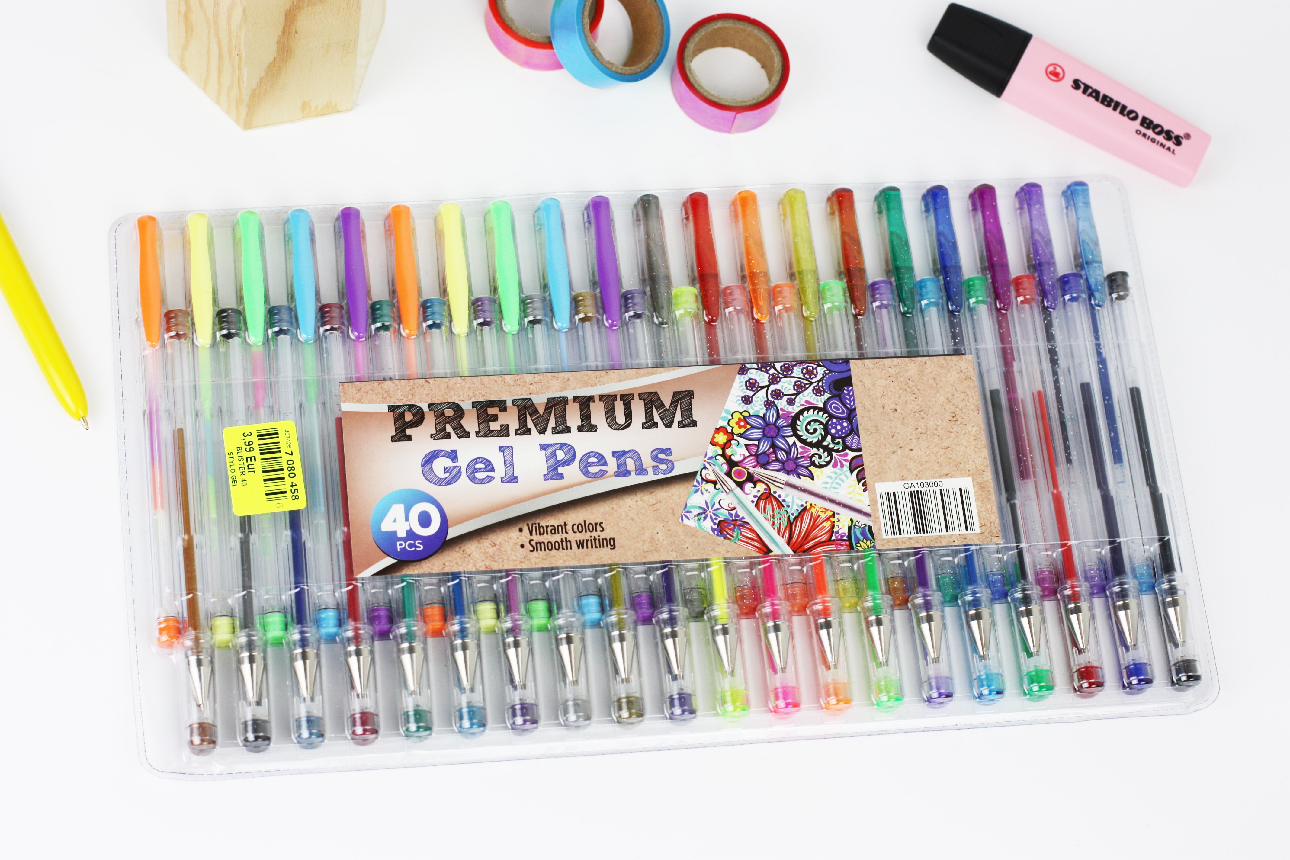 Sinon pour 3,99€, j’ai trouvé ce méga gros pack de crayon gels chez Noz. À l’intérieur, il y a 40 pièces avec des couleurs vibrantes et à pointe fine. Il y a donc 10 stylos à paillettes, 10 stylos aux teintes pastels, 10 stylos aux couleurs métalliques et 10 stylos plutôt fun – 5 fluos et 5 avec deux couleurs d’encre à l’intérieur. J’ai déjà hâte de les tester car ils ont l’air sympa et ça me rappellera les crayons Uni Ball que j’avais étant ado pour écrire les mots aux copines.