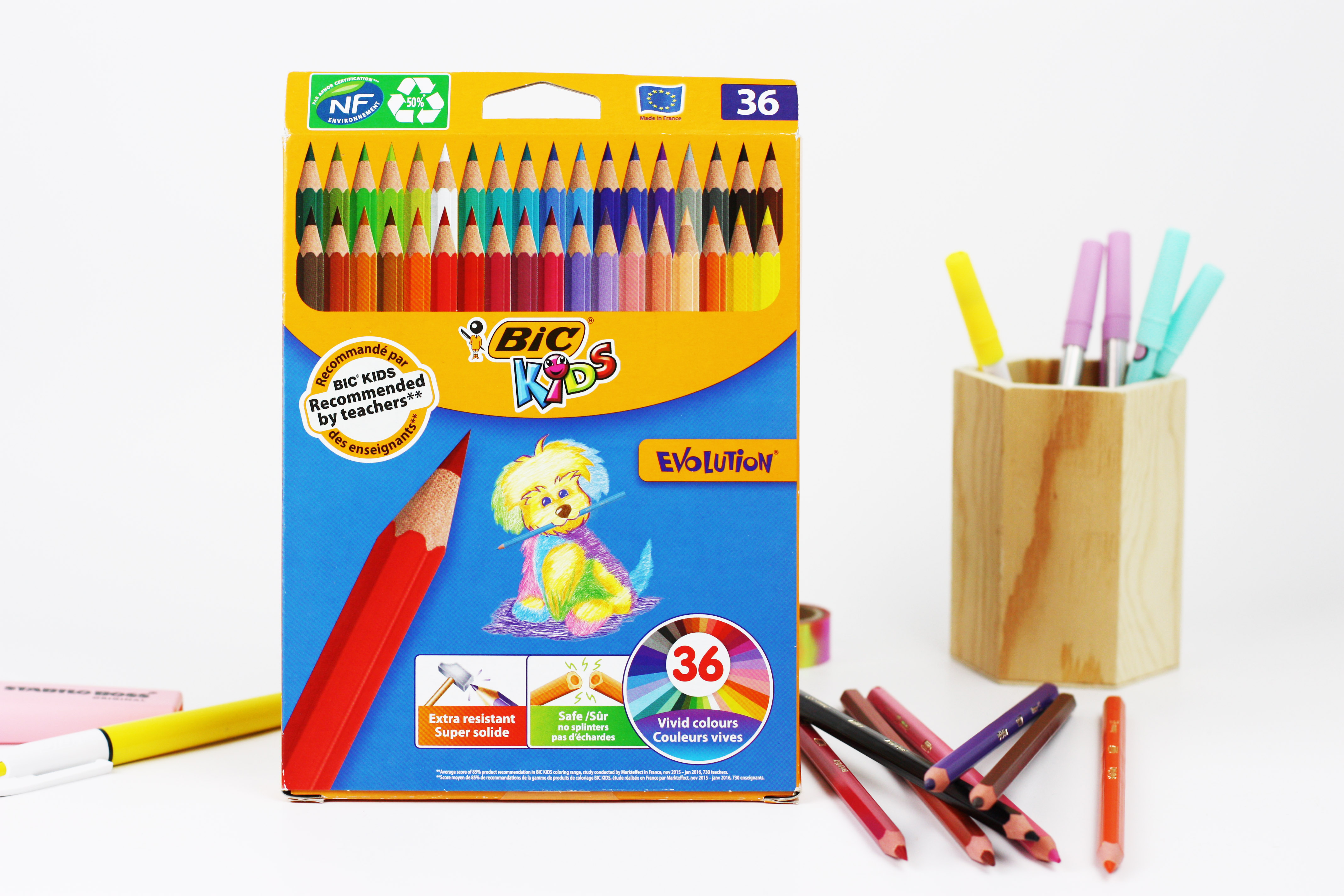 On passe maintenant aux crayons de couleurs et aux deux lots que j’ai reçu. On commence par le lot de 36 crayons de couleur Evolution que j’ai l’habitude d’utiliser depuis que je suis petite. Ils font partie de la gamme Kids mais ça, ça m’est égal. Ce que j’apprécie le plus c’est qu’il sont extra résistant, qu’ils sont solides mais aussi réalisés avec 50% de matériaux recyclés certifiés NF environnement. Généralement, un crayon ne fait pas très longtemps avec moi car j’ai une fâcheuse tendance à les tailler ,beaucoup (et ce n’est pas ma maman qui dira le contraire), mais pour se remettre au dessin, ils remportent la palme haut la main.