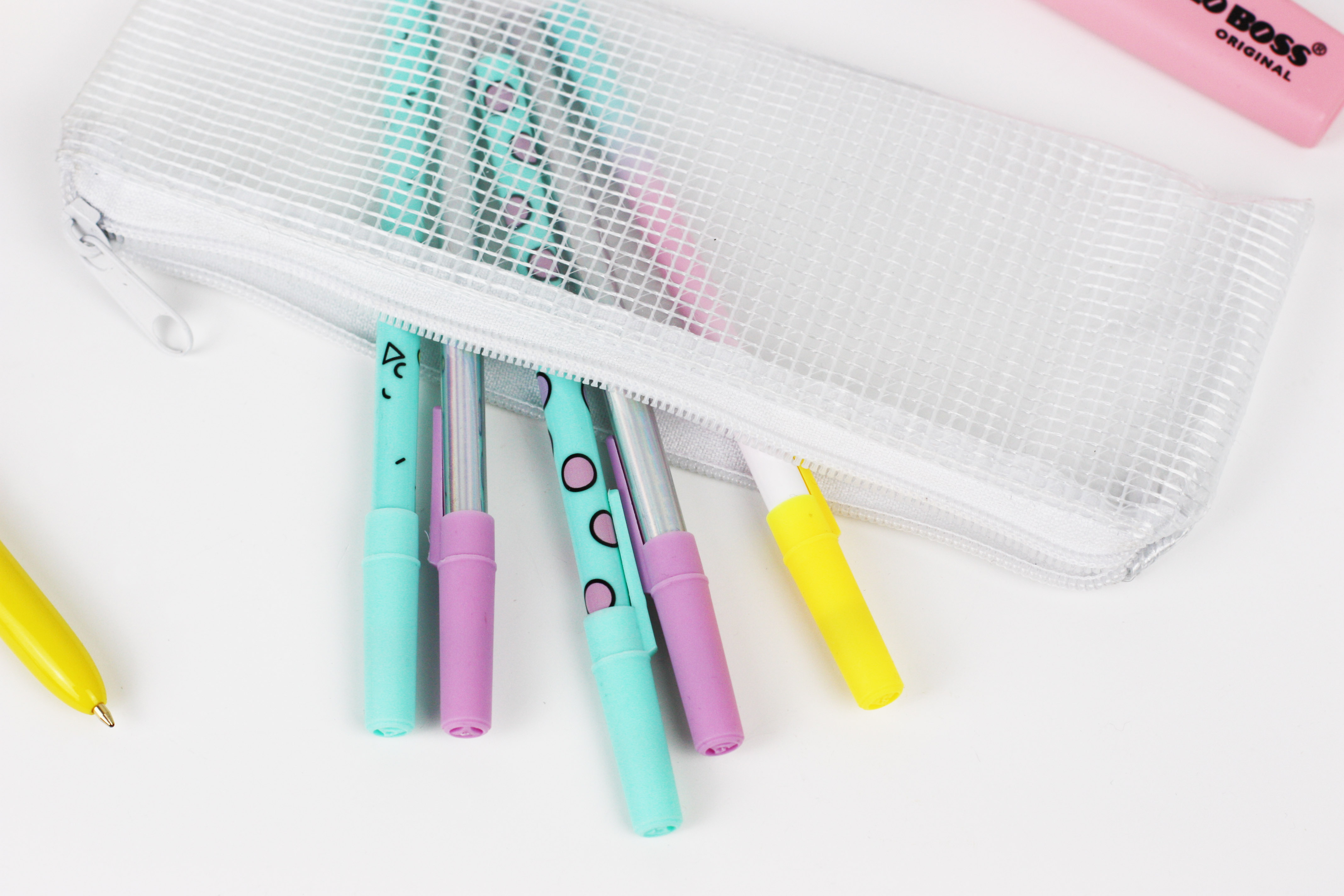 Comme vu précédemment, j’ai aussi acheté un lot de crayon chez Hema aux couleurs pastel / irisées et aux motifs un peu rétro. Pour 1€, j’ai un joli set de 5 stylos à billes qui iront très très bien avec ma trousse transparente que j’avais déjà acheté chez eux, il y a un moment. L’holographique rend super bien, je suis très fan.