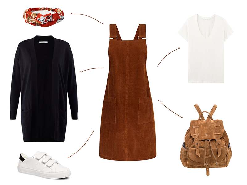 La pièce centrale de cette sélection ! J’ai flashé dessus sur le site et sa couleur bordeaux mais quand je l’ai vu en couleur marron je me suis dit banco. J’aime beaucoup son style un peu rétro avec ses larges bretelles, ses poches avant ainsi que son col carré très vintage. Cette robe est facilement portable pour la mi-saison avec un t-shirt manches courtes pour les chaudes journées de l’été indien ou avec un col montant et des manches longues pour les fraîches matinées.