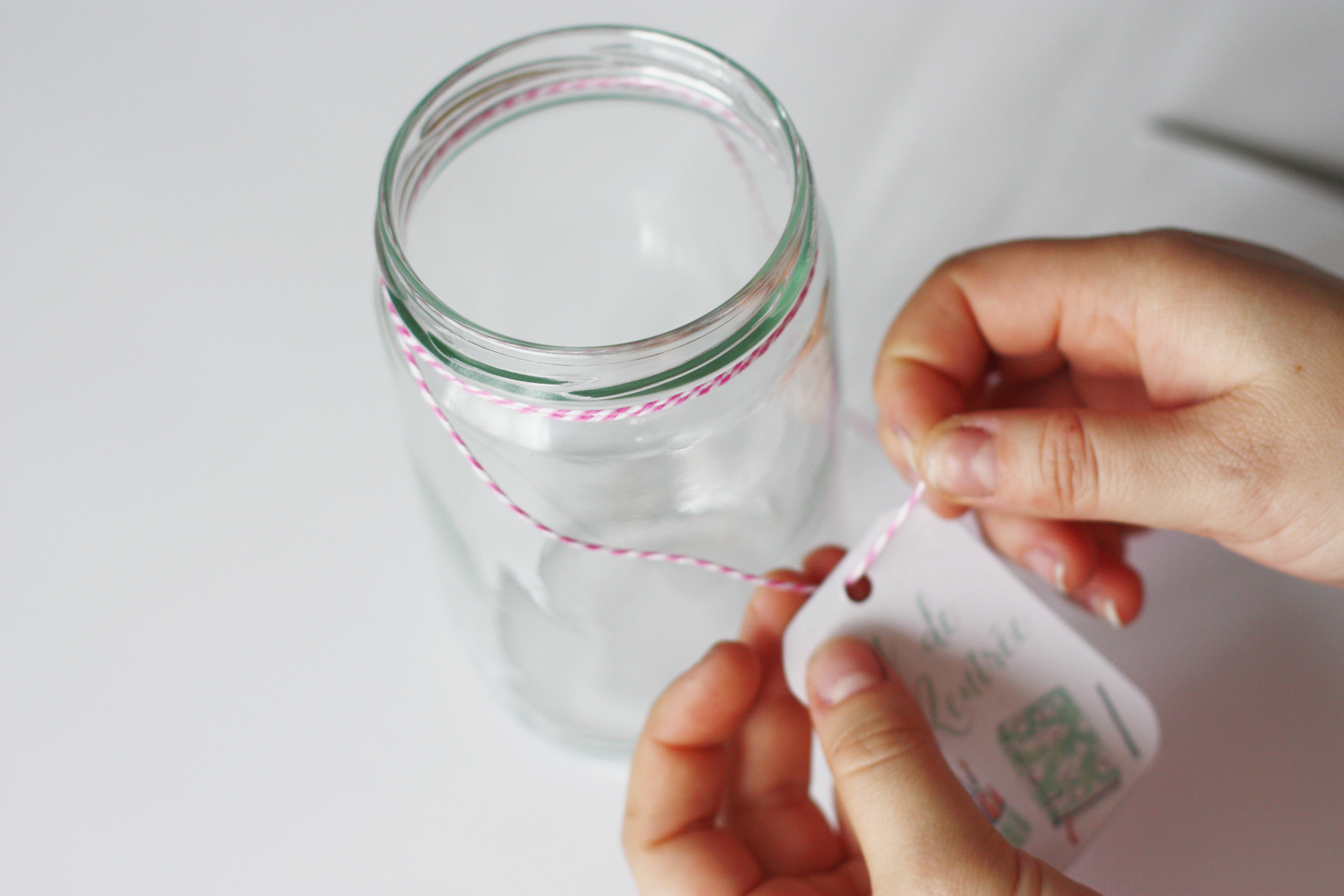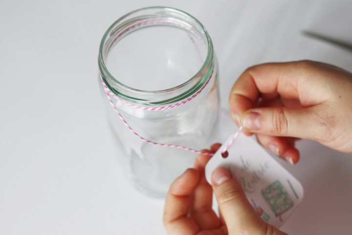 Étape 4 : Passez votre étiquette dans votre fil, faites plusieurs tours et accrochez-le sur votre bocal.