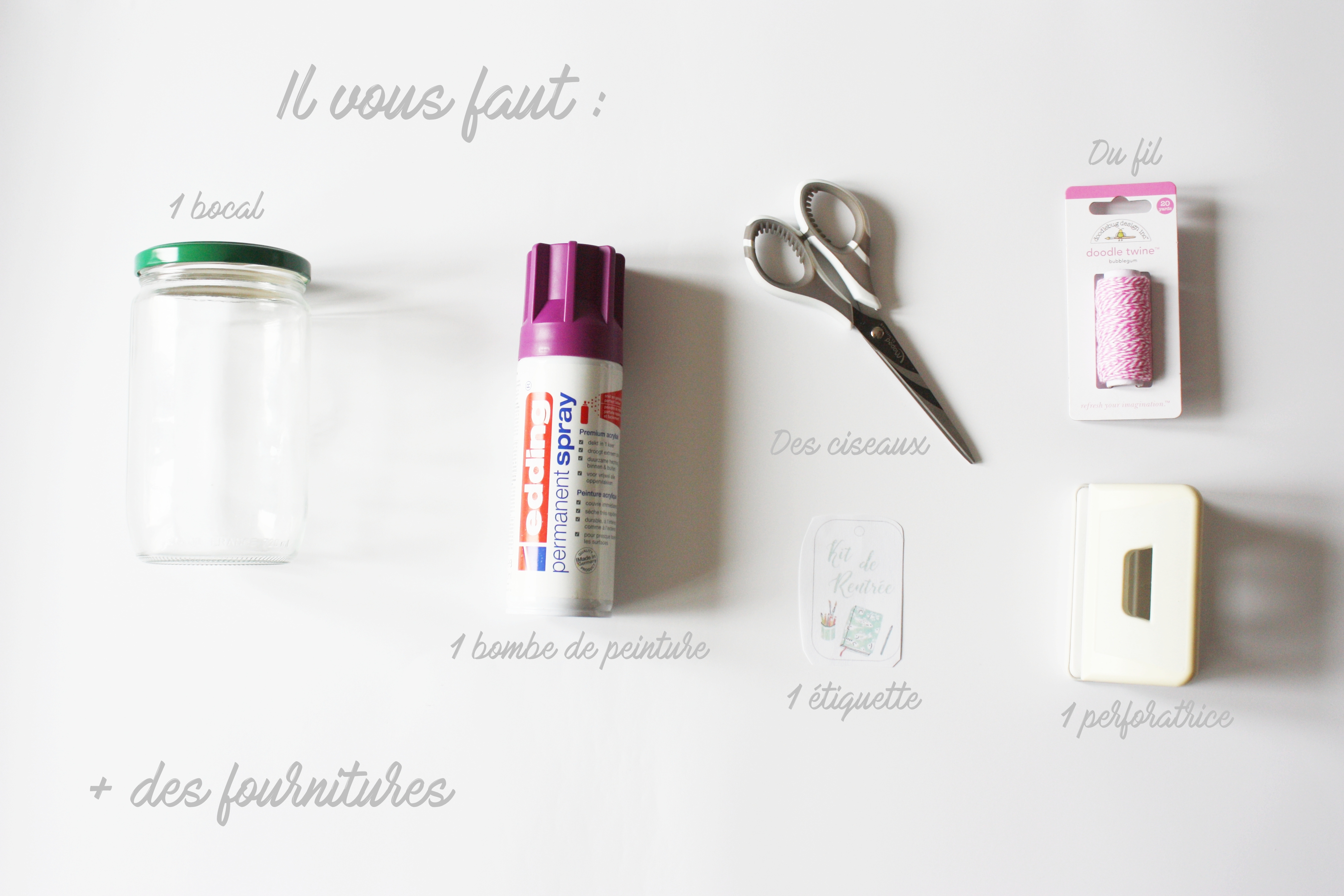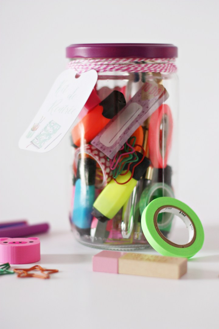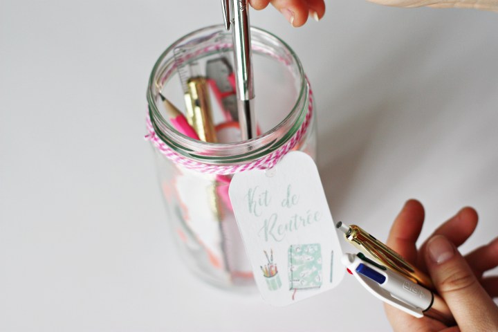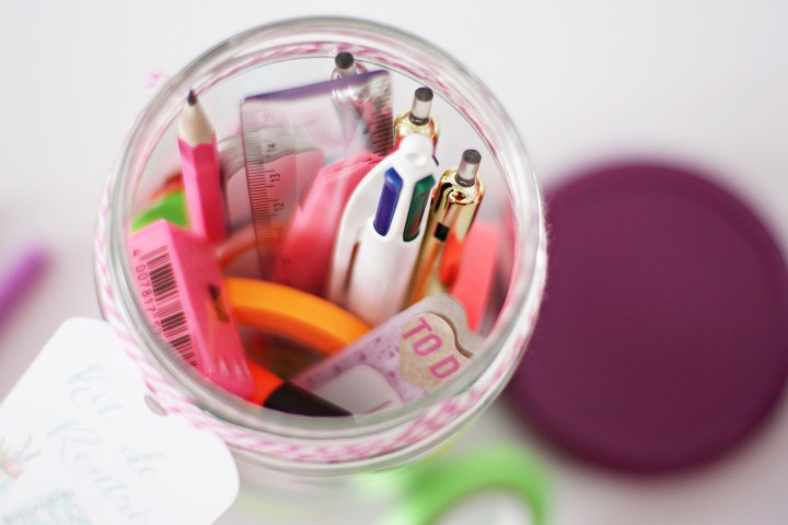 Je me suis inspirée des Teacher Survival Kits que l’on peut trouver sur Pinterest. Le principe est très simple, ce sont des minis packages de fournitures, de friandises ou de cadeaux que l’on met dans une boîte, un bocal ou encore une Mason jar et que l’on offre aux maîtres/maîtresses aux USA pour le premier jour de la rentrée. Un cadeau un peu original pour souhaiter bon courage aux enseignants pour l’année à venir. J’ai donc simplement repris l’idée pour l’adapter à mon envie et à ma frénésie de fournitures scolaires. Adios la traditionnelle trousse.
