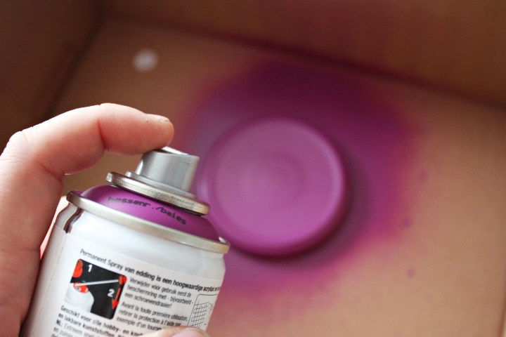 Étape 2 : À l’aide d’une bombe de peinture, peignez de la couleur de votre choix le couvercle dans un carton ou sur une surface qui ne craint pas la peinture. N’hésitez pas à repasser une couche si votre peinture n’est pas assez couvrante. Moi, j’ai réutilisé ma peinture Edding et je sais qu’une seule couche suffit.