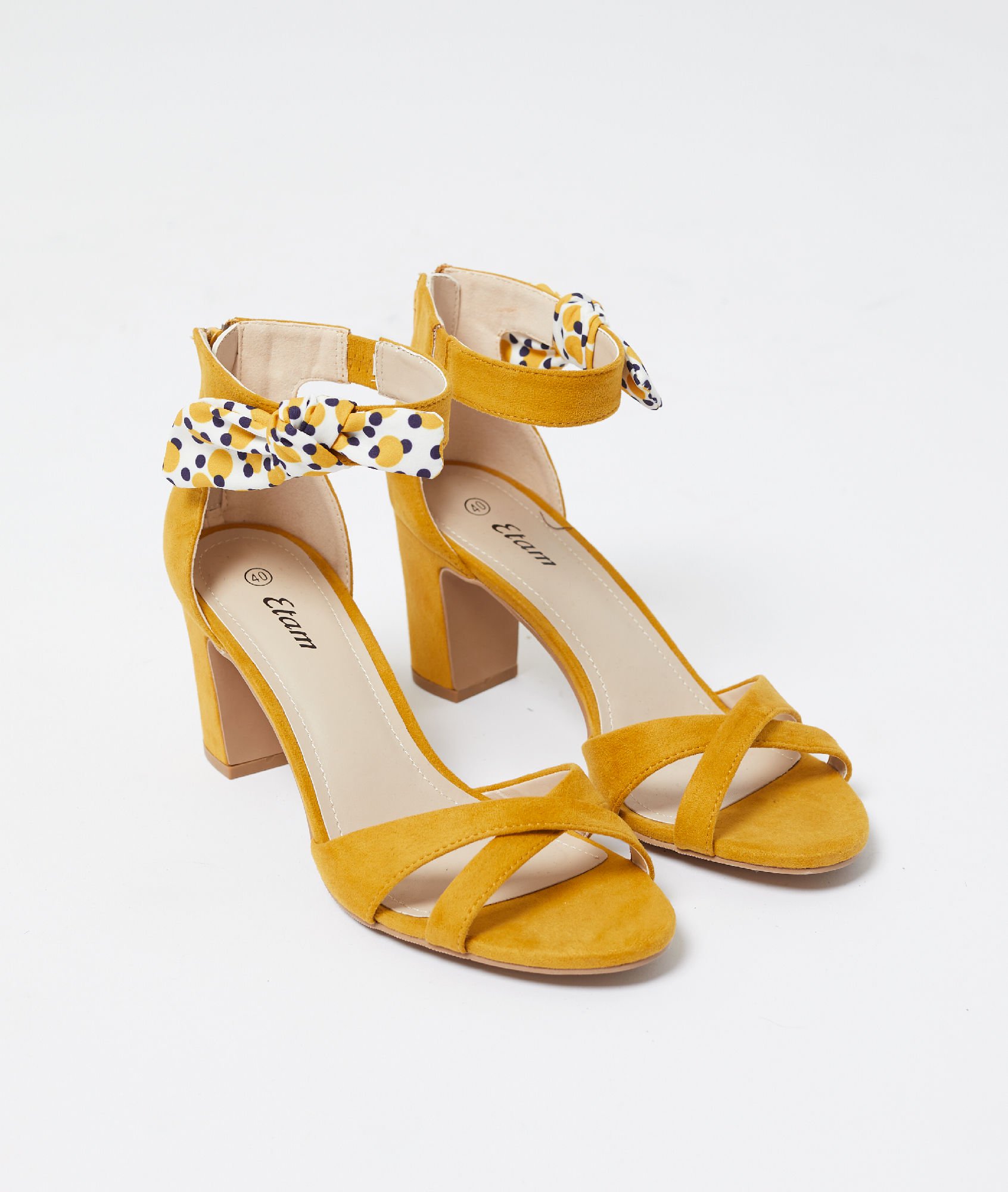 On commence cette sélection avec une petite wishlist repérée sur le site de prêt à porter Etam. J’ai flashé sur la paire de Suzon, cette jolie chaussure de couleur jaune / curry avec un petit nœud sur la cheville à l’imprimé pois (trop mignon). Ses talons de 7 cm font de Suzon, la paire indispensable pour le boulot ou pour aller danser et sa double lanière avant croisées change un peu de ce que l’on voit habituellement.