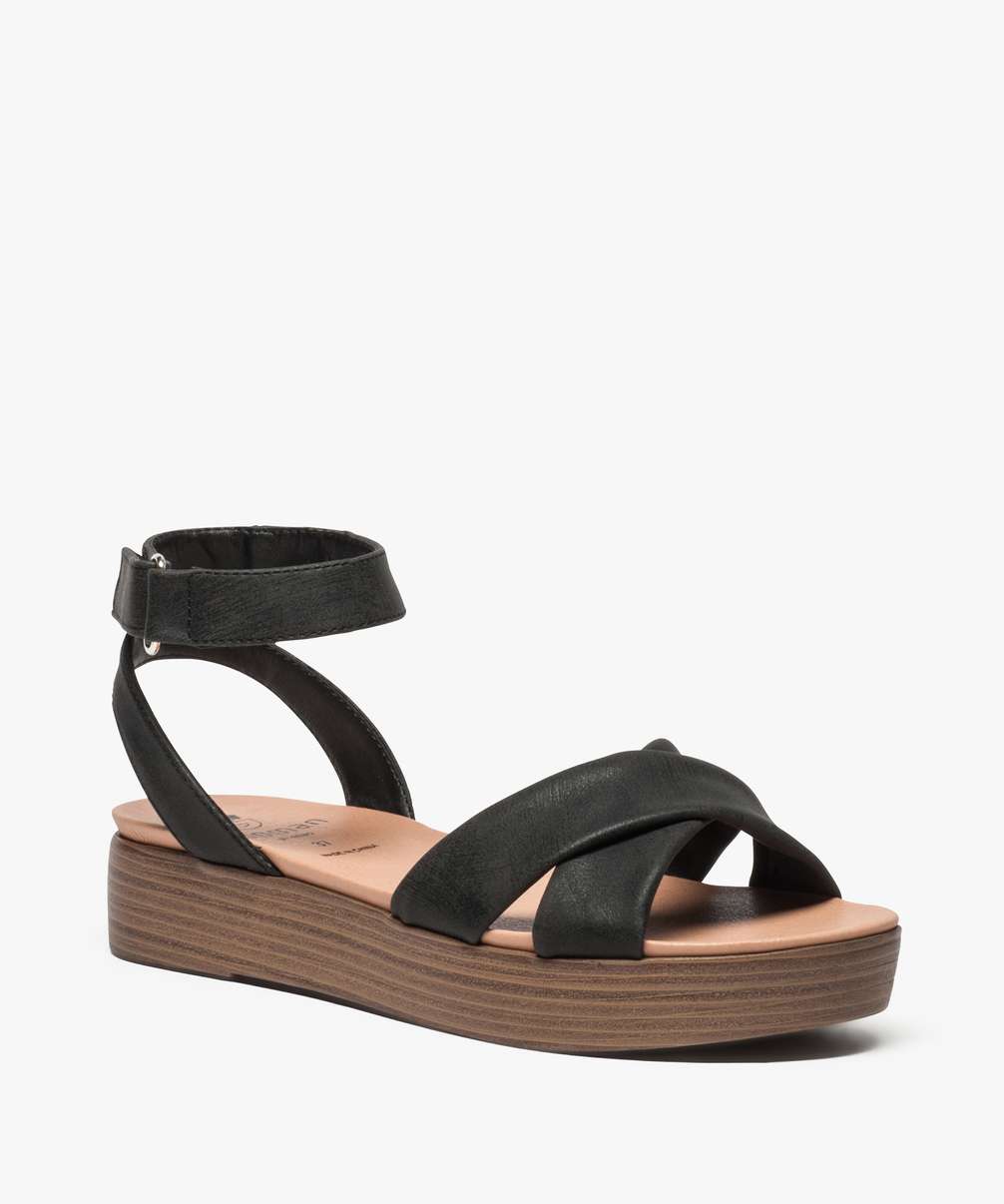 Le premier modèle est une sandale à scratch ! Et bien oui, le scratch peut être tendance ! Ces sandales plateformes sont issues du site GÉMO. Elles sont à lanières croisées sur le devant et avec une bride à scratch. C’est le petit détail qui change tout ! Elles ont une forme assez classique mais font l’affaire pour un style au top.