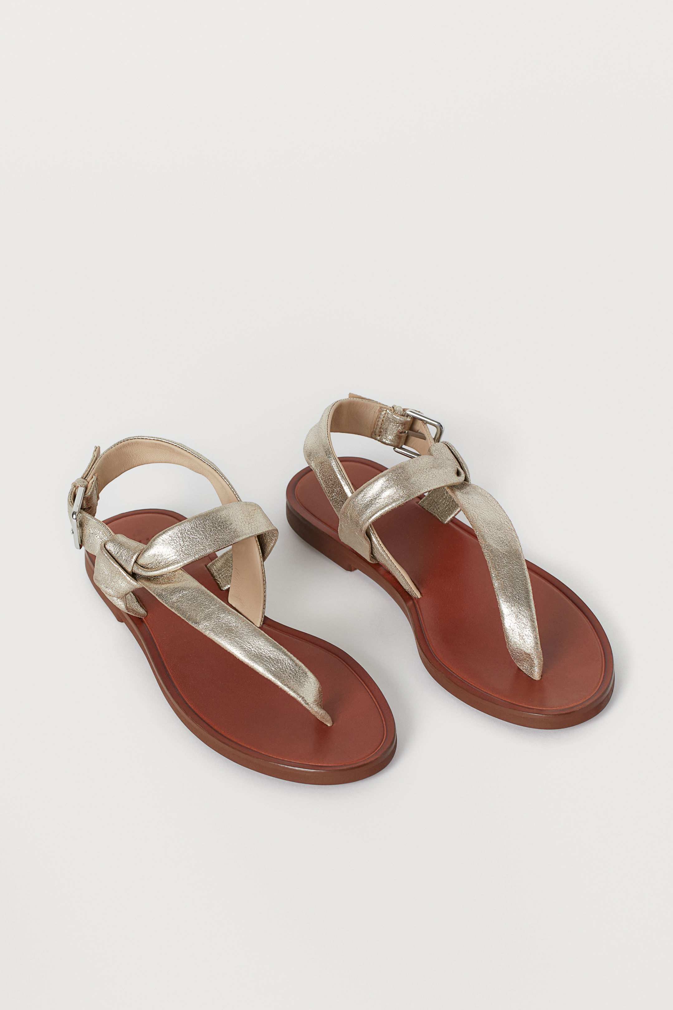 La cinquième paire est une paire de nu-pieds en cuir trouvées sur le site H&M. Alors là je m’étonne moi-même d’avoir sélectionnée une couleur dorée ! Ce modèle avec bride de cheville ajustable est hyper sympa. Son noeud sur le côté en font une paire tout à fait originale et pratique à porter. Avec un joli bronzage, ça va faire des ravages !